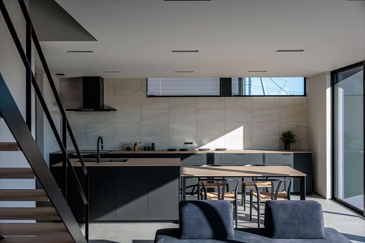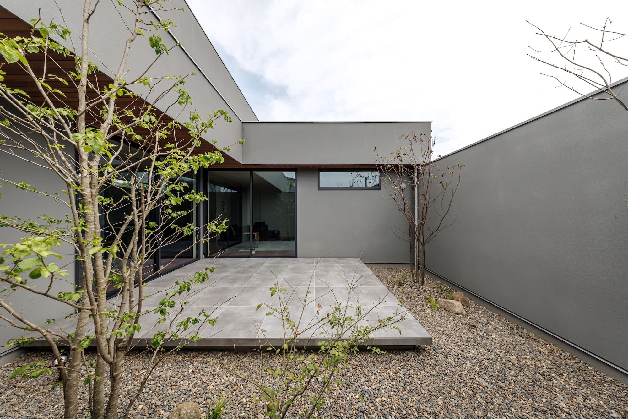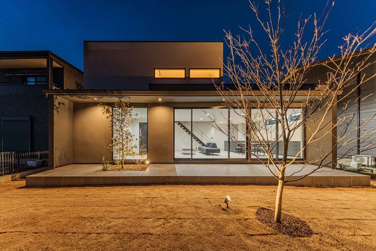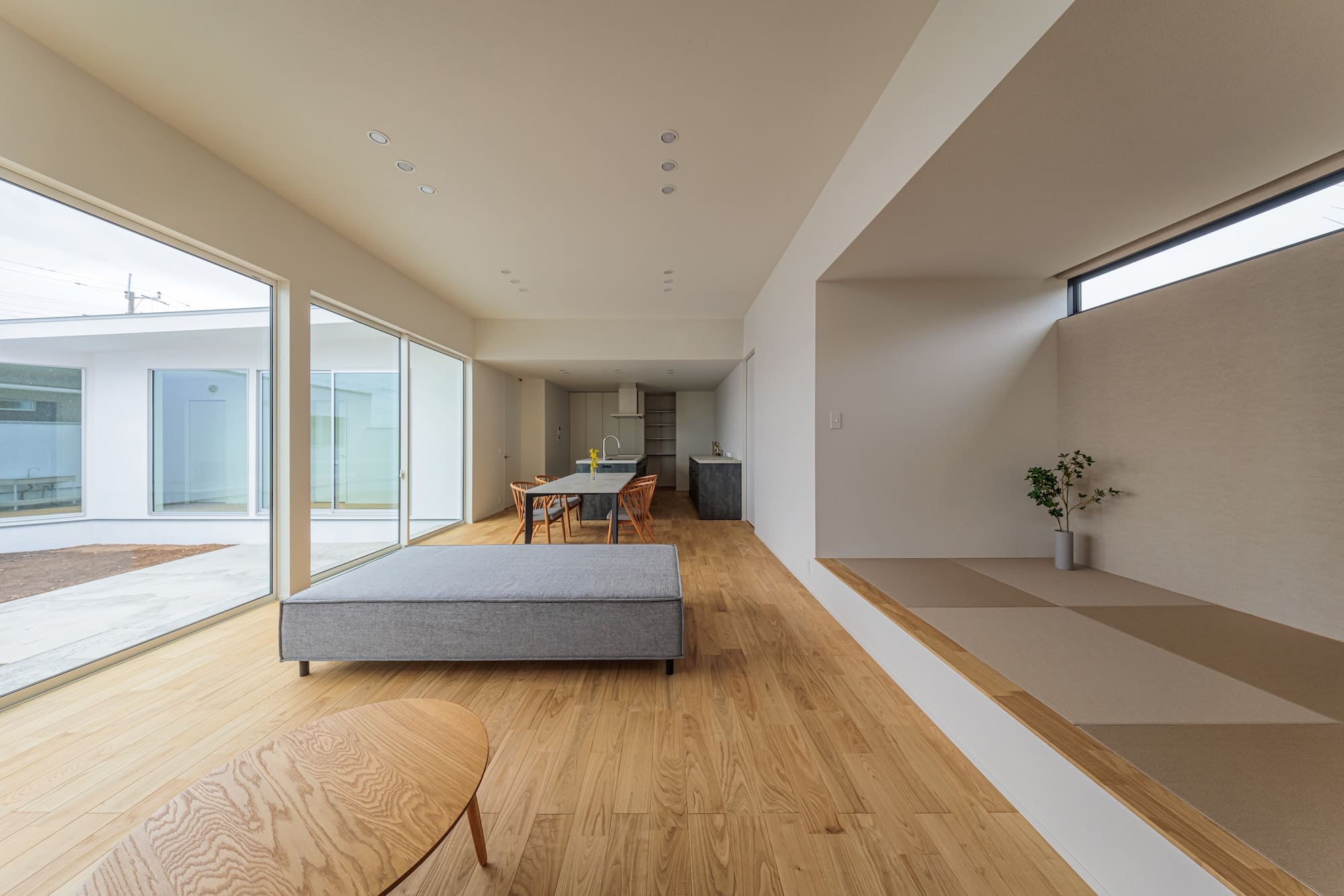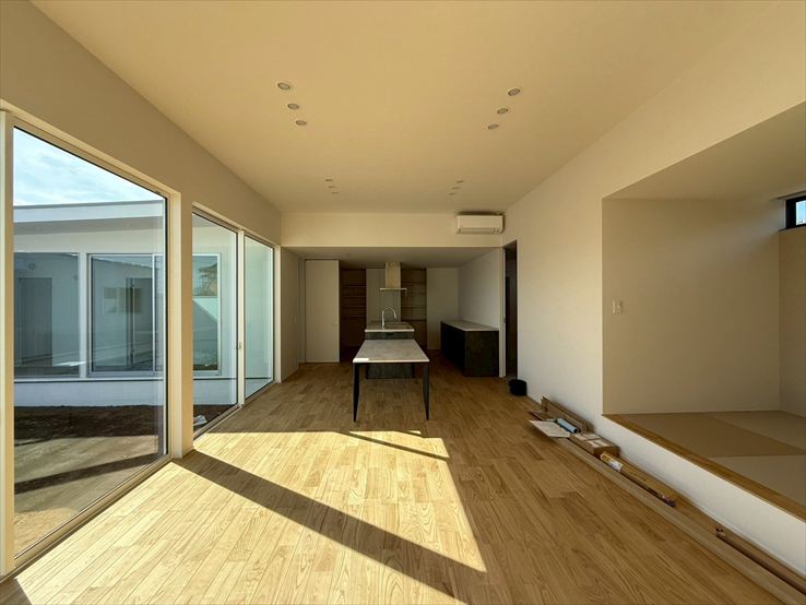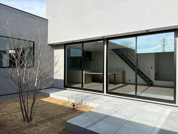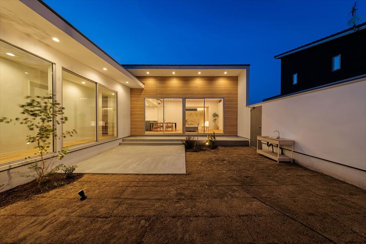 建物をコの字型にして、中庭を設けた住まい。外と内を緩やかに繋ぐ中庭が、プライバシーを確保しつつ、光を呼び込みます。開放感と明るさをテーマにデザインした空間です。
