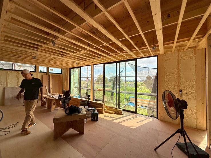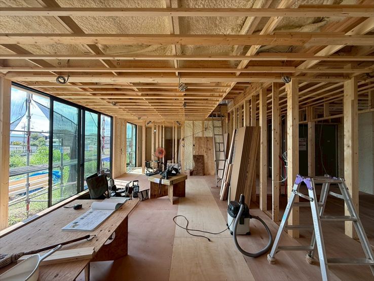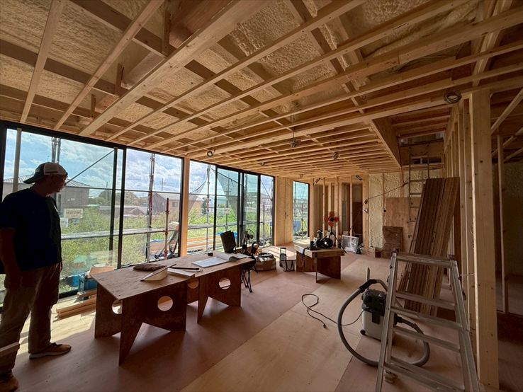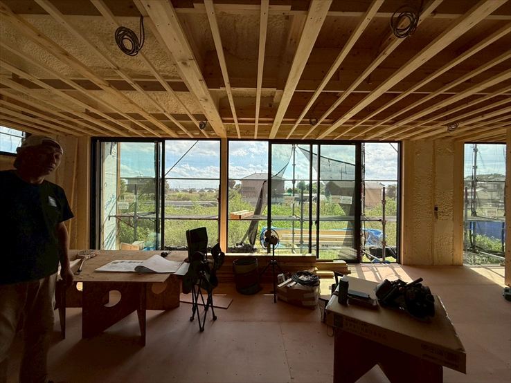 [CUBIC]では断熱工事を終え、現在は木工事を進めています。大開口の窓が並ぶことで、リビングは開放感あふれる空間に仕上がる予定です。