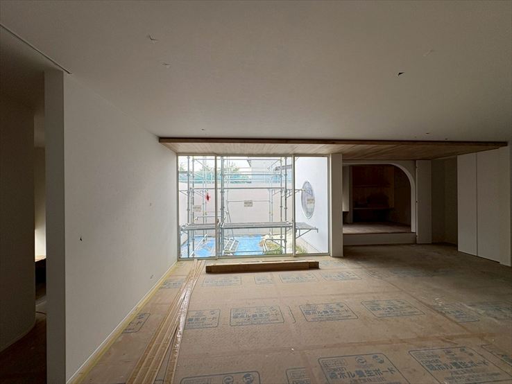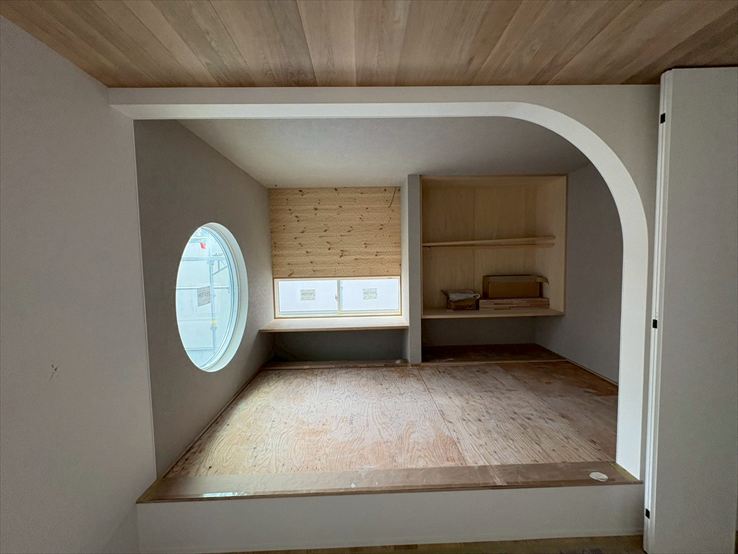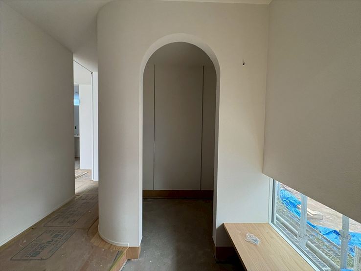 窓や壁など、曲線を取り入れた空間で構成して、全体的に柔らかさが出るようにしています。玄関では、R壁にして視線が室内へと誘導されるようにデザインしました。和室の入口も垂れ壁を曲線にして、アクセントにしています。調和の取れたよい空間になりそうです。