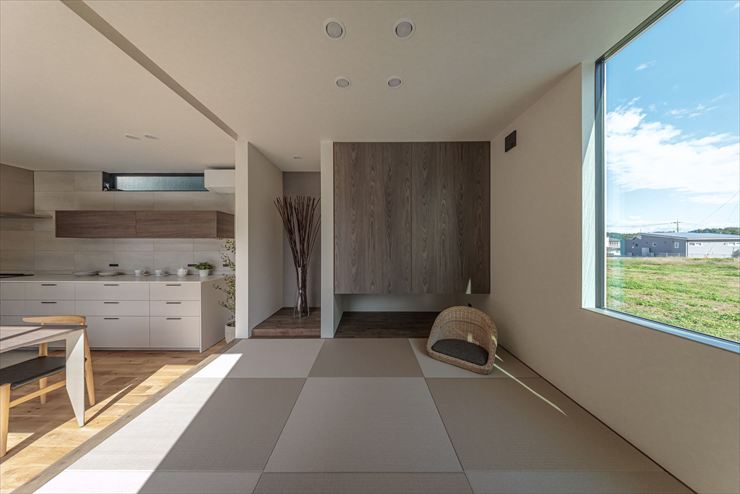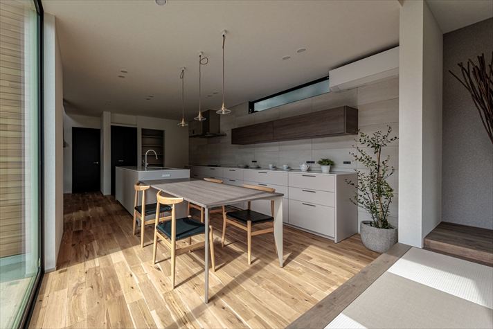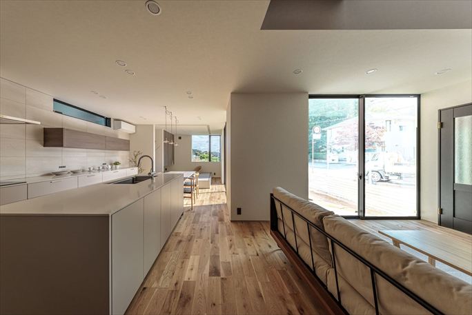 ENSEMBLE 毎日の暮らしを真剣に考え、細部までご夫婦のこだわりをデザインした住まい。 眺望のより東側を眺める書斎コーナーや和室など、 ちょっとしたゆとりをプラスしています。 キッチンを中心にリビング、庭、和室と見渡せるので ご夫婦も安心してお子様を見守ることができます。 外観は幾層にも重なっているようなファサードにして、オリジナリティを演出しました。