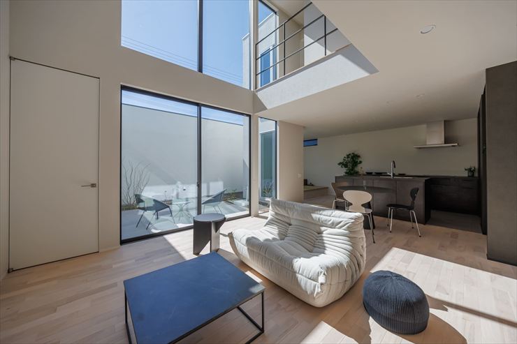 <吹き抜けと目隠し壁のあるリビング>