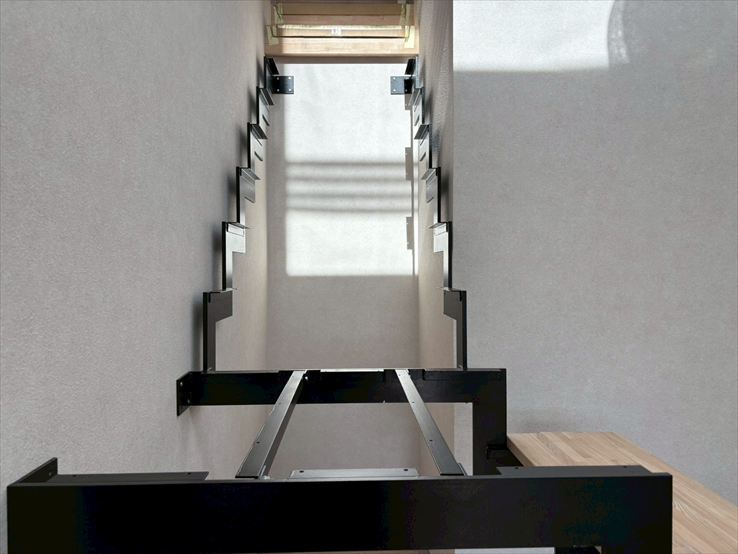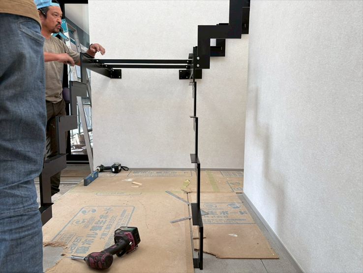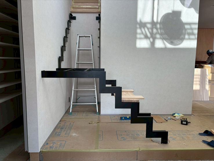 箱型階段の鉄骨部分を設置しました。この段階では、ギザギザしていて、完成形が分かりにくいのですが、完成するとこんな感じになります。