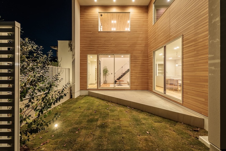 ENSEMBLE 夜になるとまた違った表情を見せてくれます。外観のシンプルな構成にあたたかな灯りが重なり、建物の輪郭がやさしく浮かび上がる佇まいが印象的です。 大きな窓からは、木を基調とした室内の落ち着いた光がこぼれ、庭とのつながりがより静かに感じられます。吹き抜けを通して広がる柔らかな灯りも、空間に穏やかな深みを添えています。