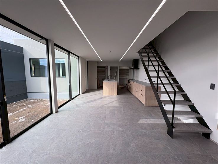 ライン照明のあるリビング。納まりもうまくいきました。既存のライン照明器具は非常に高価になるのですが、このリビングでは溝を作り間接照明を連続して設置することでコスパのよいライン照明を実現しています。