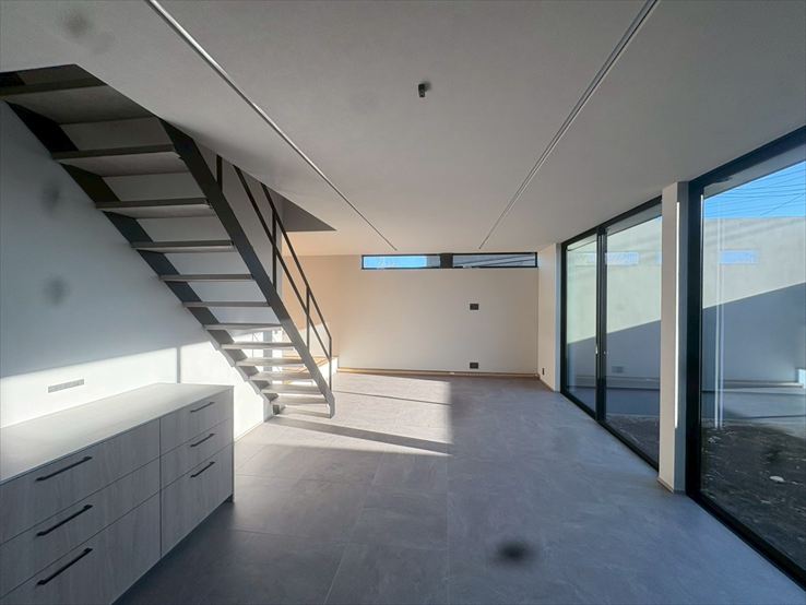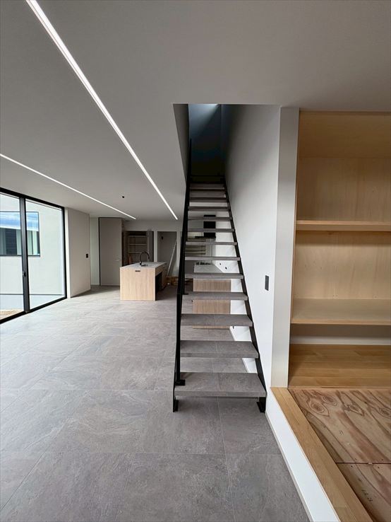 リビングのアイアン階段ですが、今回はこだわりのタイル風踏板にしました。LDKのタイルと同素材で仕上げ、床と階段の連続性が出せるようにしています。初めての試みでしたが、いい仕上がりです。キッチンは天板をストーン調、側板を木目の組み合わせにして、木質間を出すことで無機質なLDKのアクセントにしています。色味が揃うことでまとまりのある空間になりました。