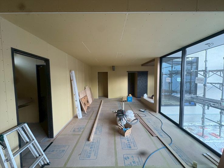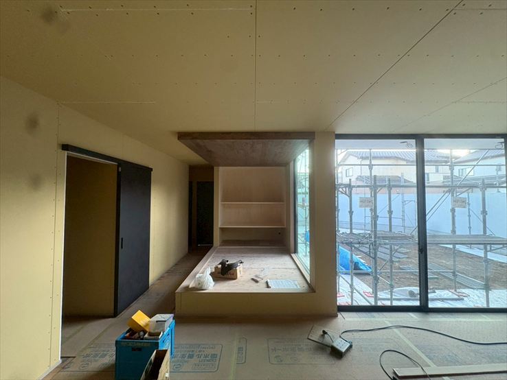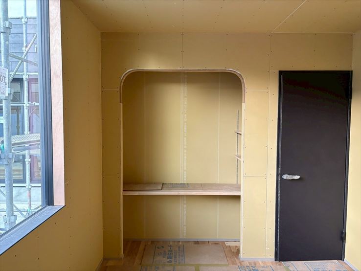 木工事も終盤です。和室が併設されたL型リビングも輪郭が見えてきました。光の入り方もよい感じです。和室とリビングの一体感もイメージ通り。寝室の化粧スペースに作ったR下がり壁は、奥様のこだわりの場所。朝の身支度も気持ちよくできそうです。