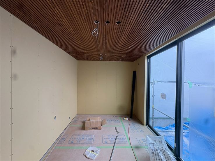 タイル張りのLDK。キッチンの天井にリブ材を貼り、木質感を出すことで、無機質になり過ぎないようにバランスを取りました。色味もいい雰囲気です。寝室には、キッチン天井と異なるサイズのリブ材を貼り、落ち着きのある感じに仕上げました。床の養生が剝がれるのが楽しみです。
