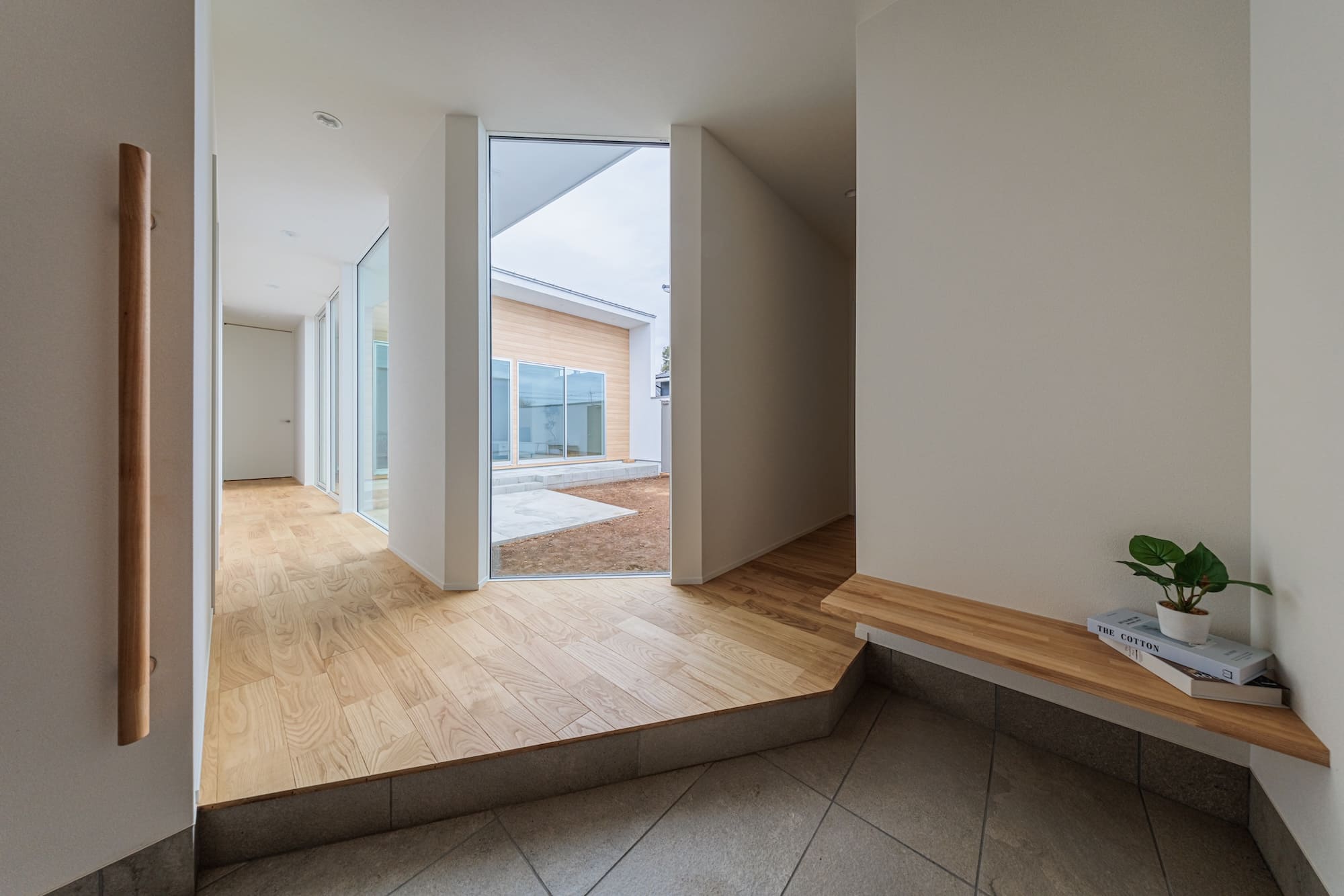 PATIO 一歩室内に入ると、素材の質感と光の表情がやさしく暮らしを包み込みます。 落ち着いた木の色味、透明なガラス越しに届く光。 「暮らしの動線」と「居場所の心地よさ」を大切にしたからこそ、 どこにいても、自然な落ち着きと安心感を感じられる空間になっています。