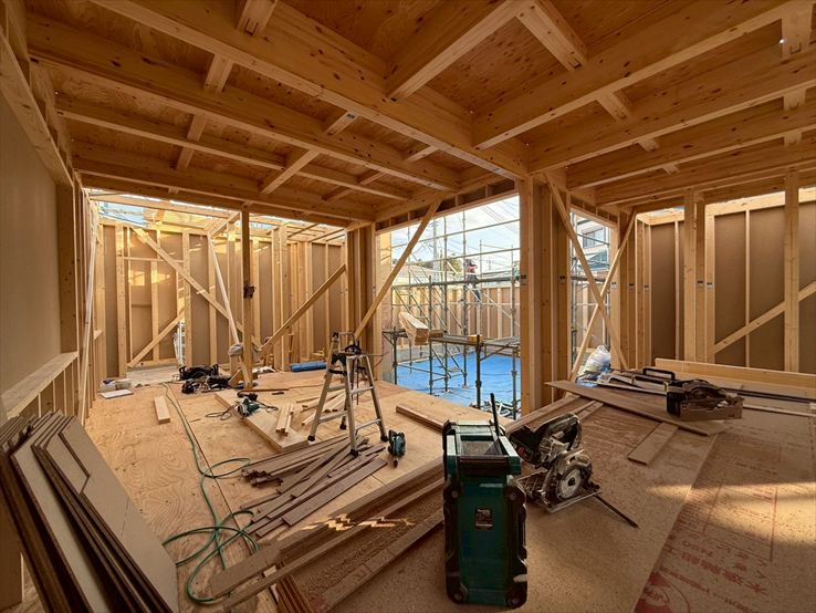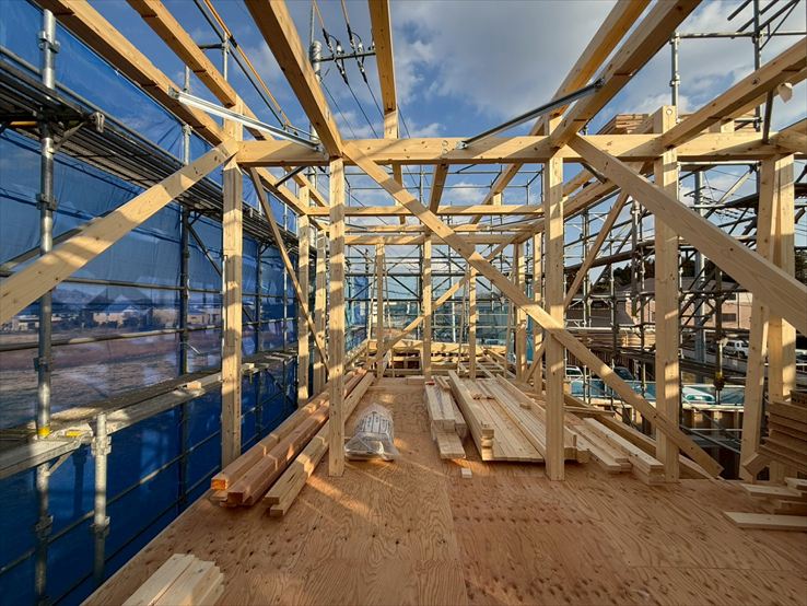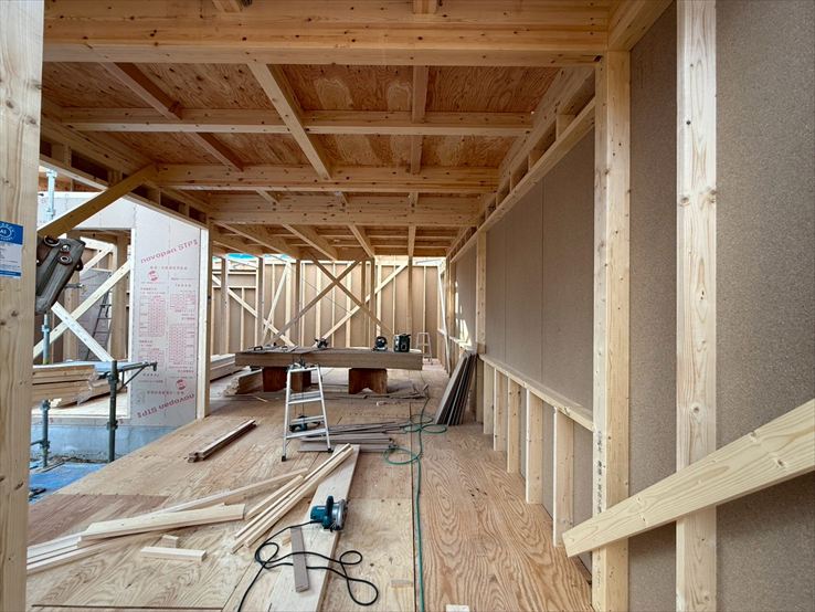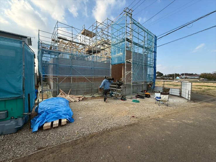 春の陽だまりの中、モダンな住まいの上棟を行いました。田園風景を一望できる絶好の立地に、モダンでクールな住まいを計画しました。モノトーンに抑えた色調とシックなリビングは、フロアタイルの床とリブ材の天井で仕上げていきます。ディティールにこだわって、ノイズレスな住まいに仕上げていきたいと思います。
