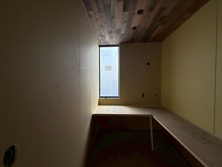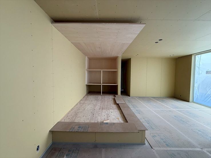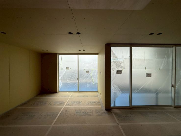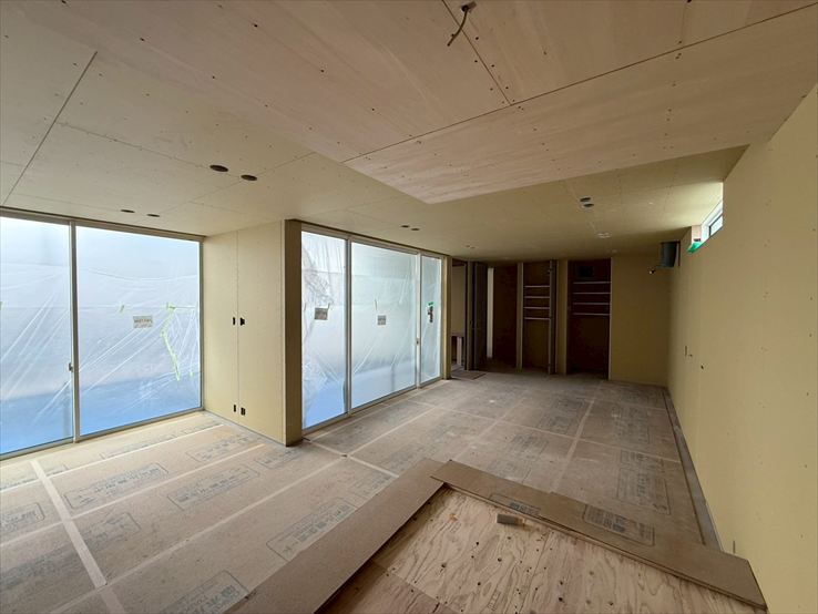 木工事が完了して、清掃も終わりました。これからクロス工事が始まります。雁行したリビングの窓から入る光が、いい雰囲気になりました。奥行き感を出して視線が奥へ誘導され、広がりを感じることができそうです。リビング内に内包された和室もリビングのよいアクセントになります。書斎は古材を天井に張り、味わいのある空間に仕上げていきます。まだまだ、他にもギミック満載の楽しみなプロジェクトです。まだ先になりますが、完成見学会を予定しておりますので、お楽しみに!