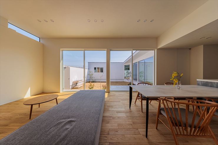 昼と夜で異なる表情が楽しめるのもよいですね。 光と風を呼び込む中庭は、見て良し、使って良し。 毎日が特別な時間となりそうです。