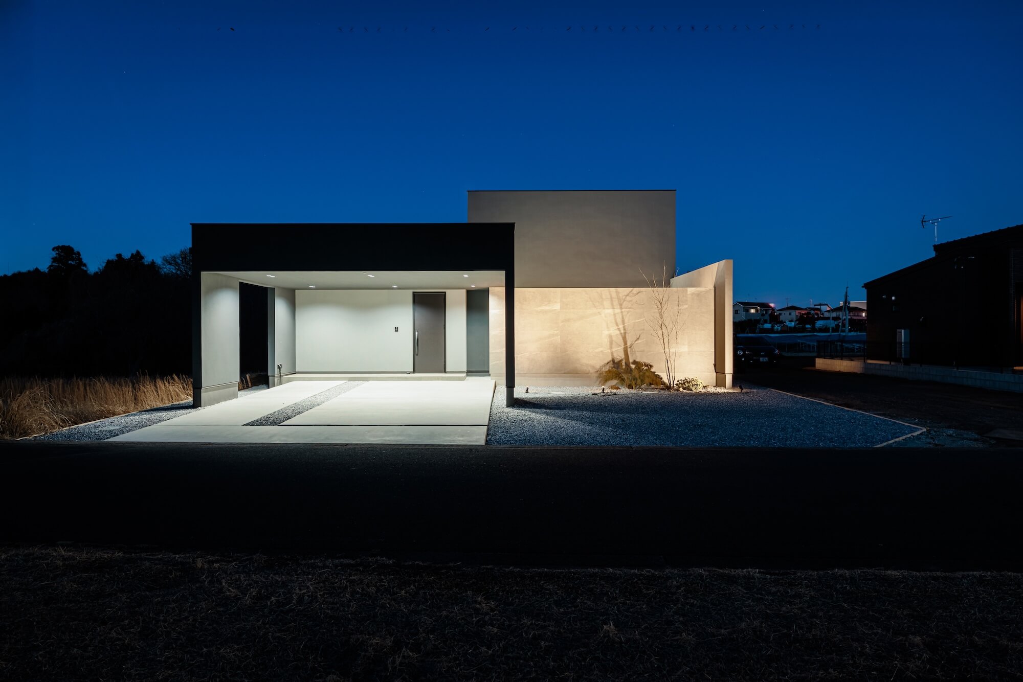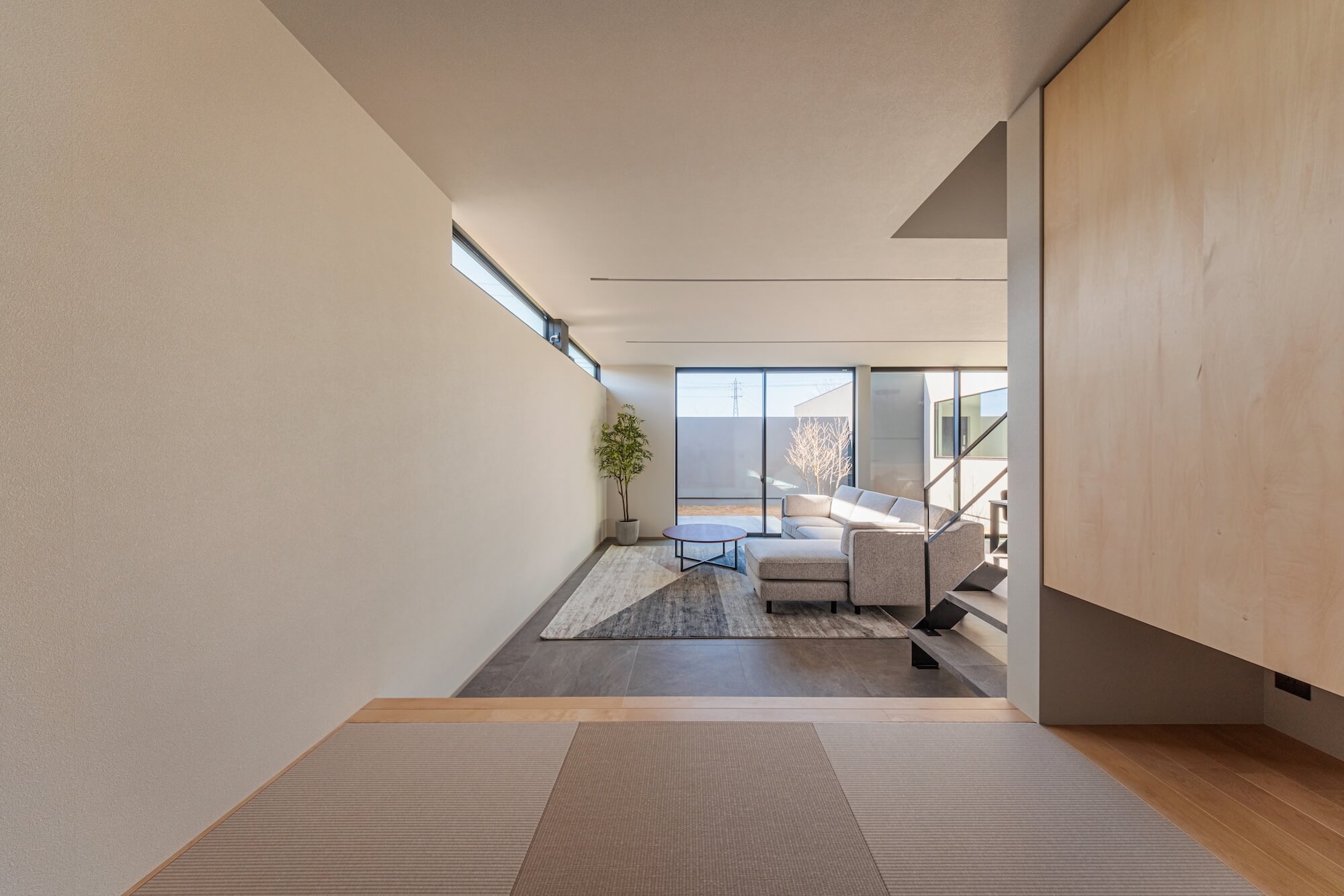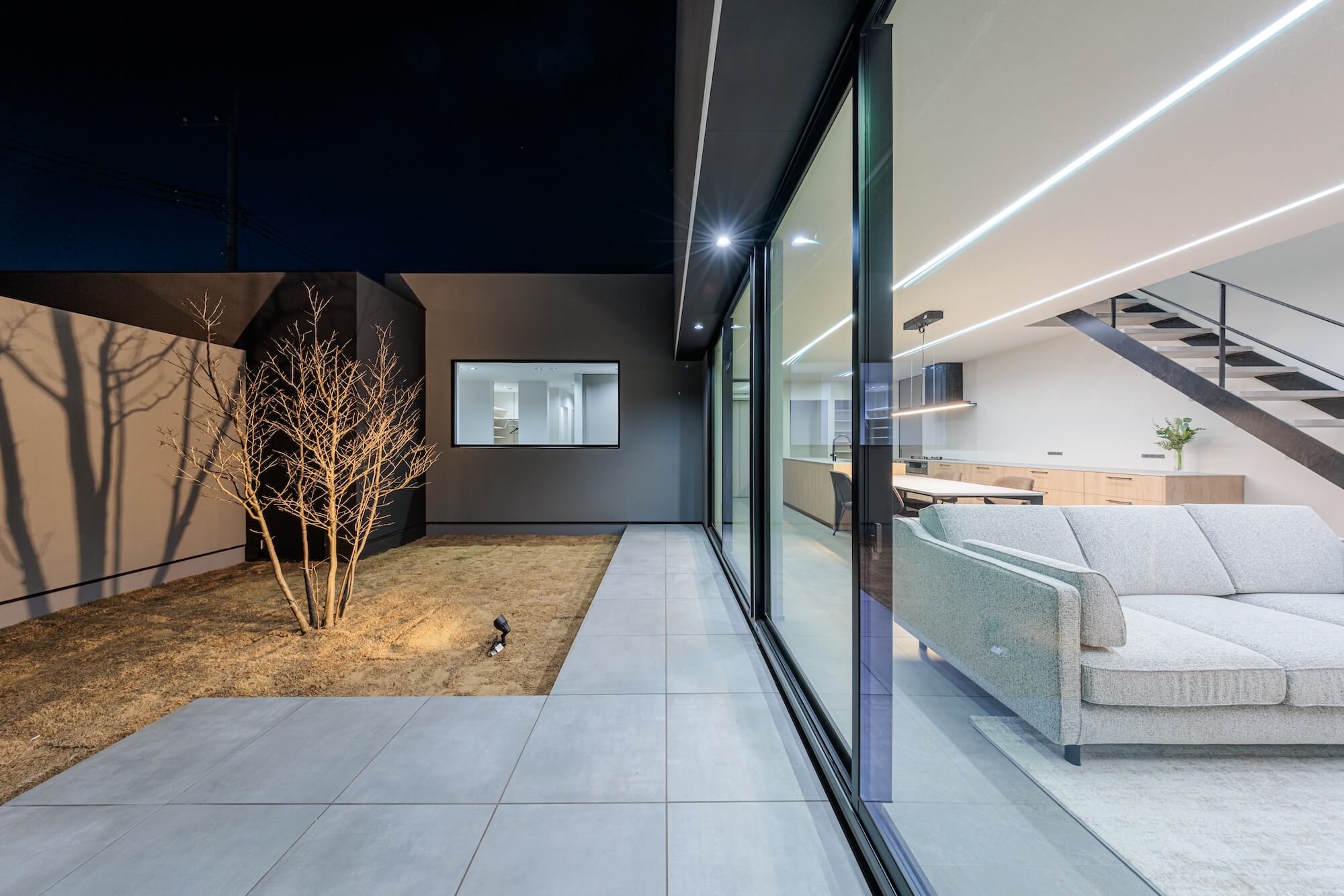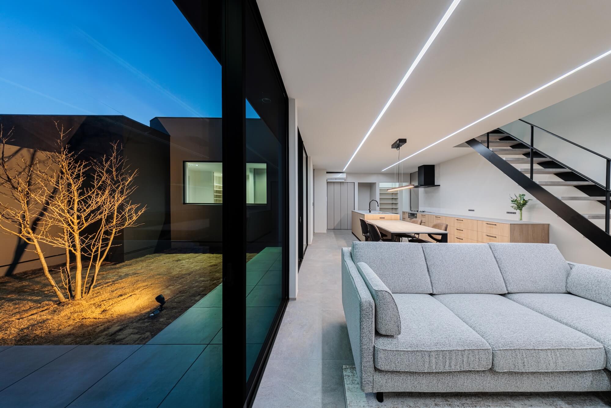 天井に伸びるライン照明が空間の奥行きを強調し、やわらかな光が中庭までゆるやかにつながります。