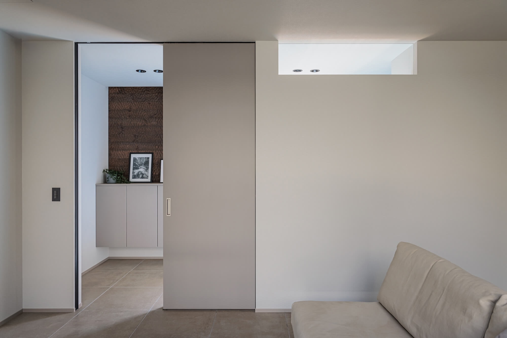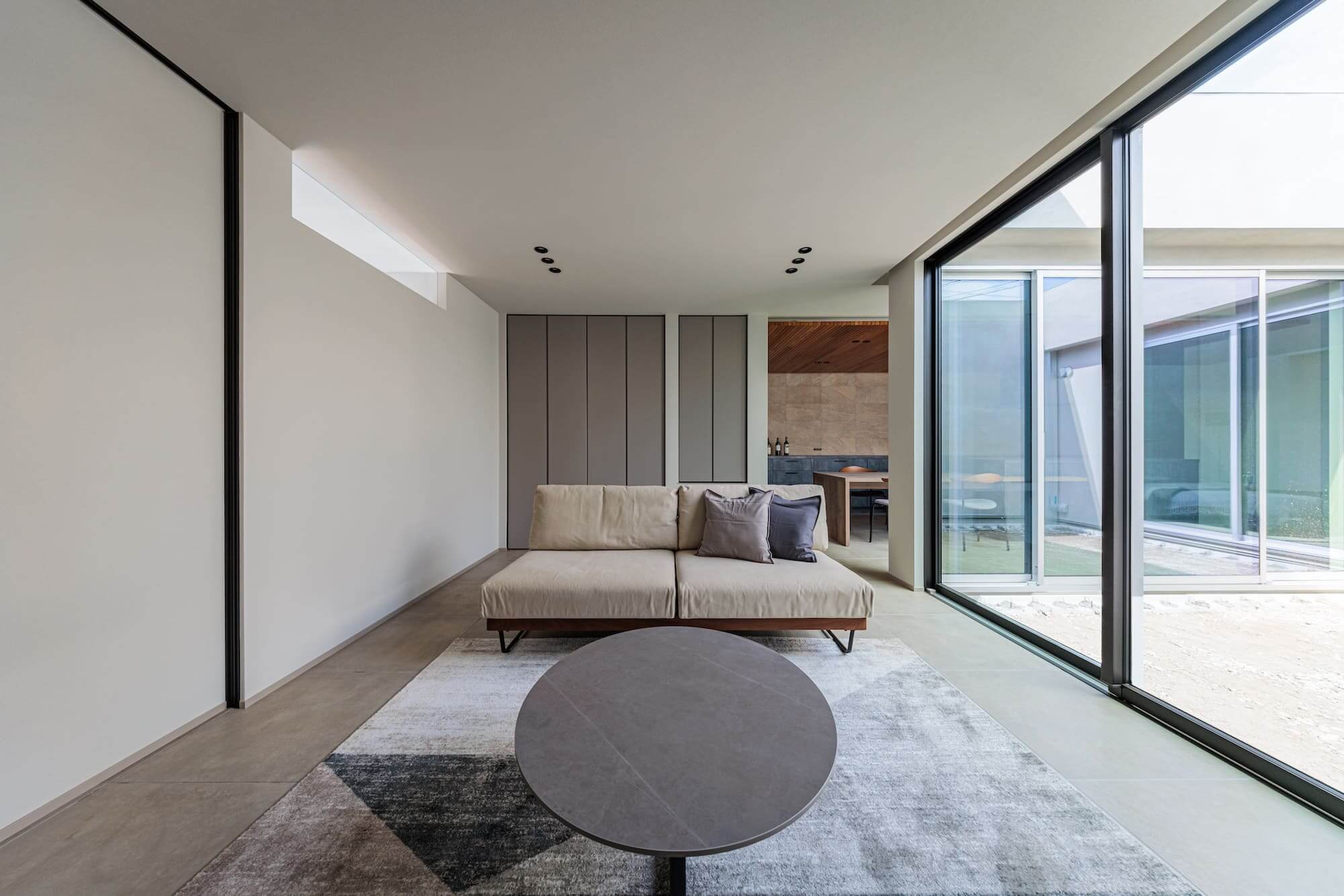 外からの視線をやさしく遮りながら、内側にはしっかりと光を取り込むことで、安心感と開放感を両立。時間帯によって変わる光の表情が、空間にやわらかな変化を生み出します。