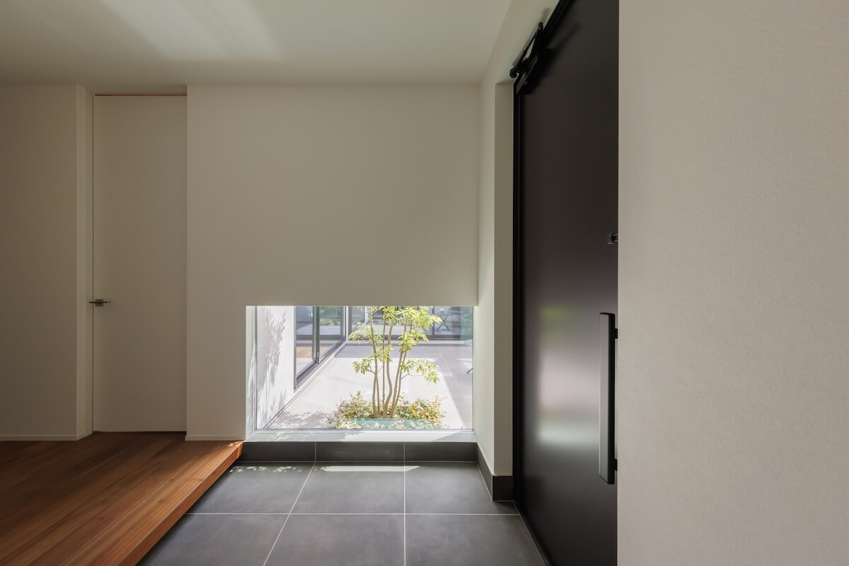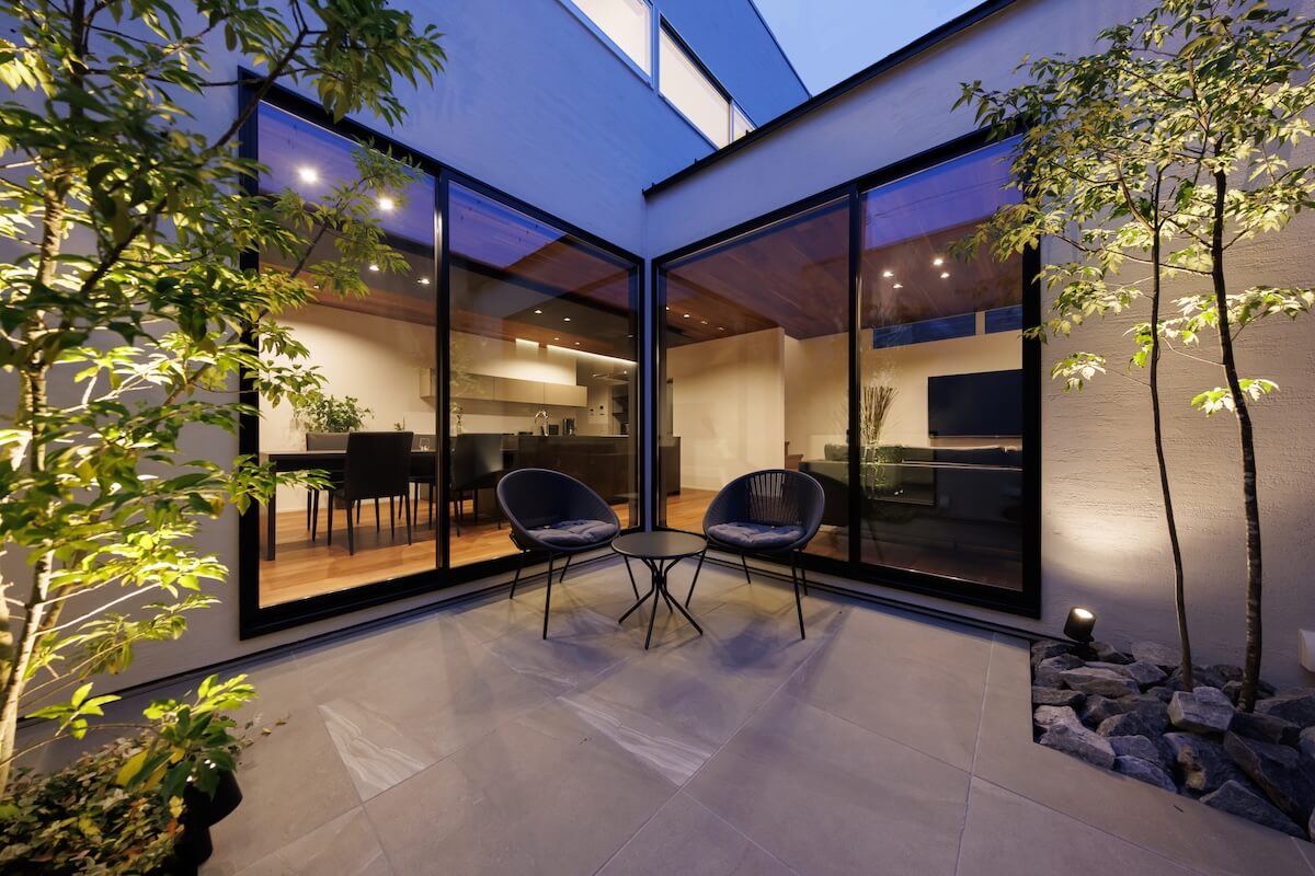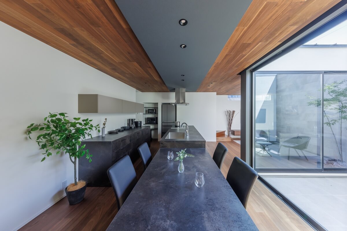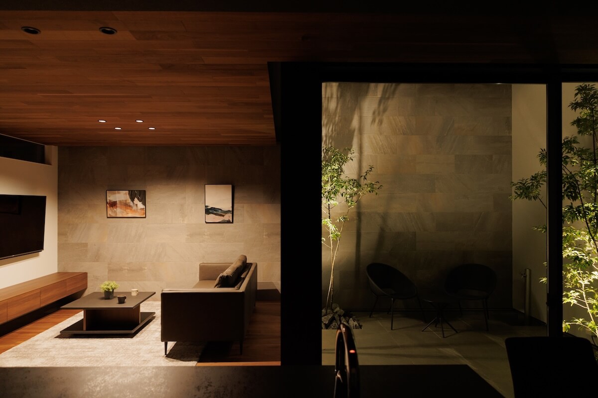 高い壁に守られた中庭は、外の視線を気にせず過ごせる安心の場所。光や風を受け止めながら、家族だけの穏やかな時間を育みます。木や石の素材感をいかした空間が住まい全体に広がり、静けさと心地よさに包まれた暮らしが、毎日に深い落ち着きをもたらします。