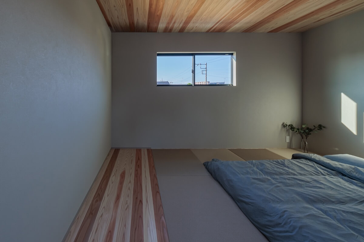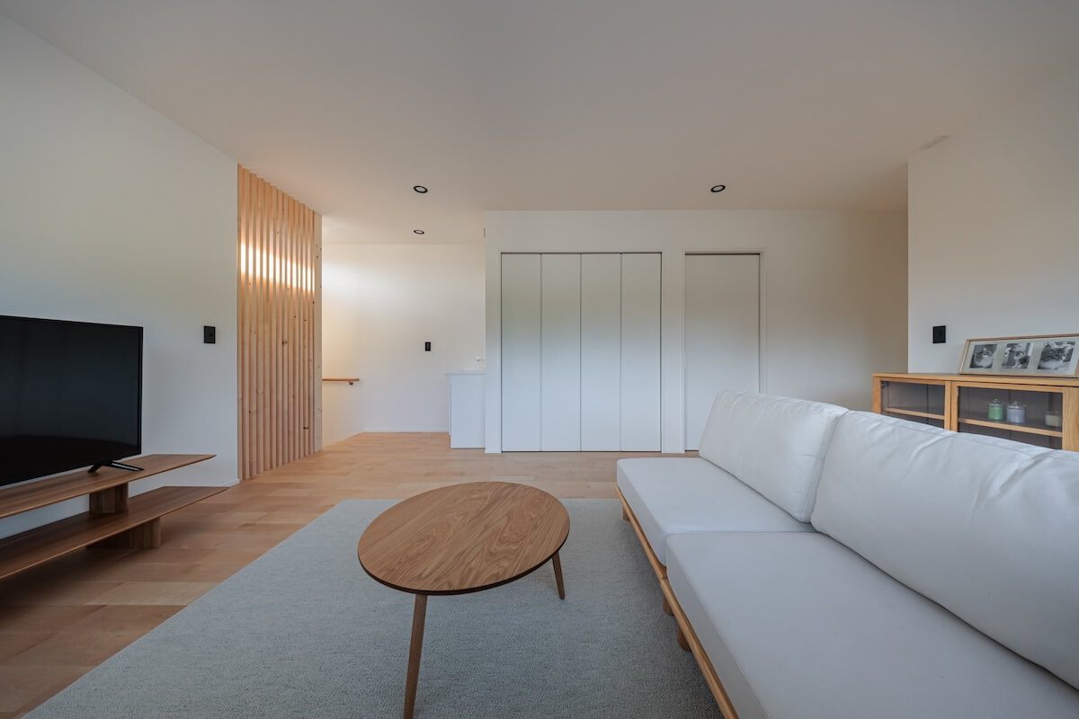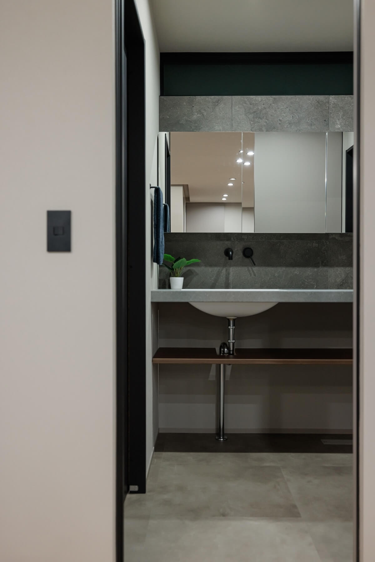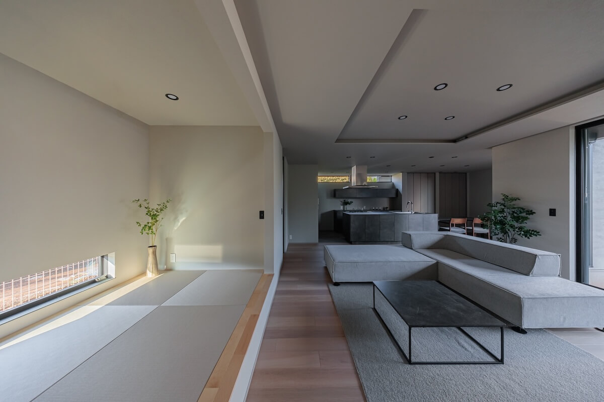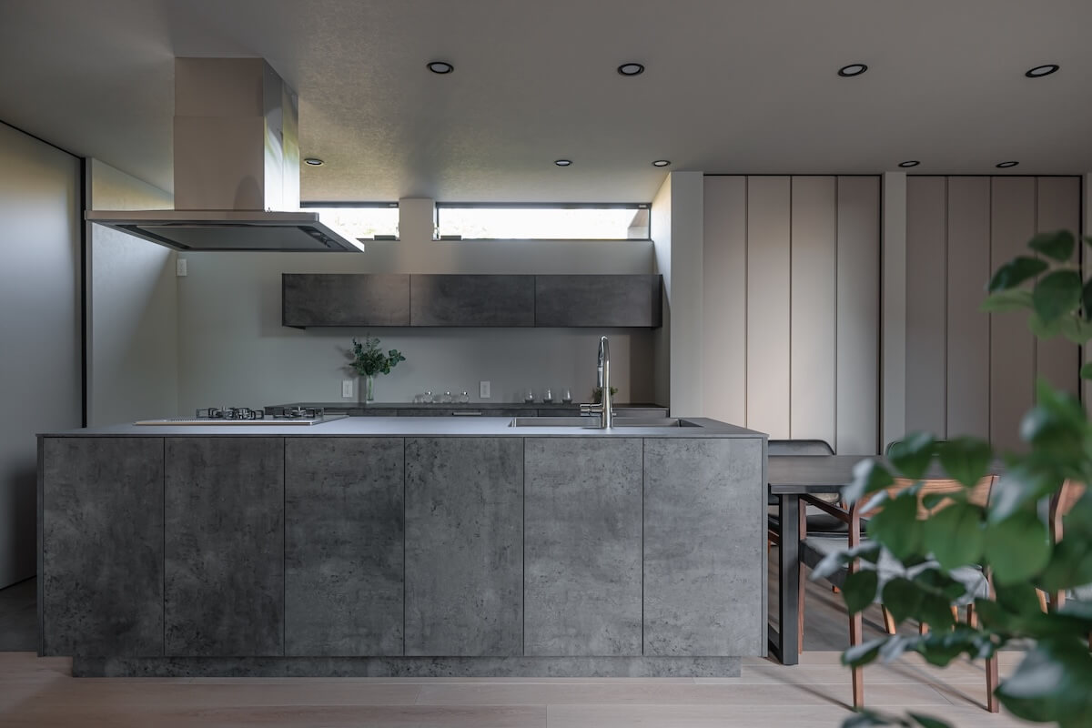 石、木、モルタルが調和し、静かな存在感を放つ住まい。夜のあかりに照らされた外観は、美術館のように凛とした美しさをまといます。その一方で、室内には家族がほっとくつろげるやさしい時間が流れています。