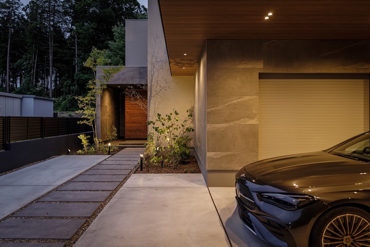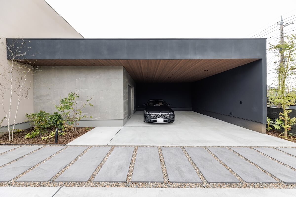 屋根に守られた静かなガレージは、車を置くだけでなく、暮らしを豊かにする余白の空間。外と内のほどよい距離感が、日常に特別感を添えます。