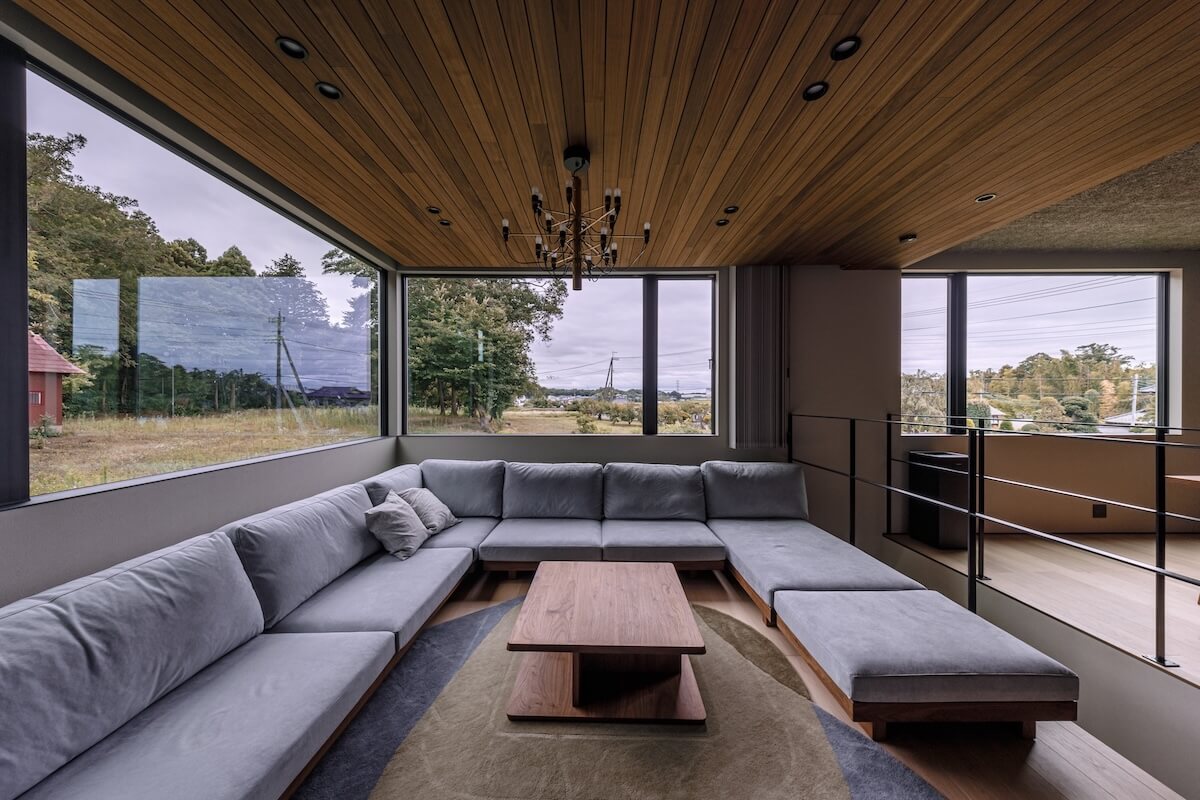 大きく切り取られた窓が、森の風景をそのまま室内へ。柔らかなソファに身を預ければ、時間の流れがゆっくりとほどけていく、くつろぎのリビングです。