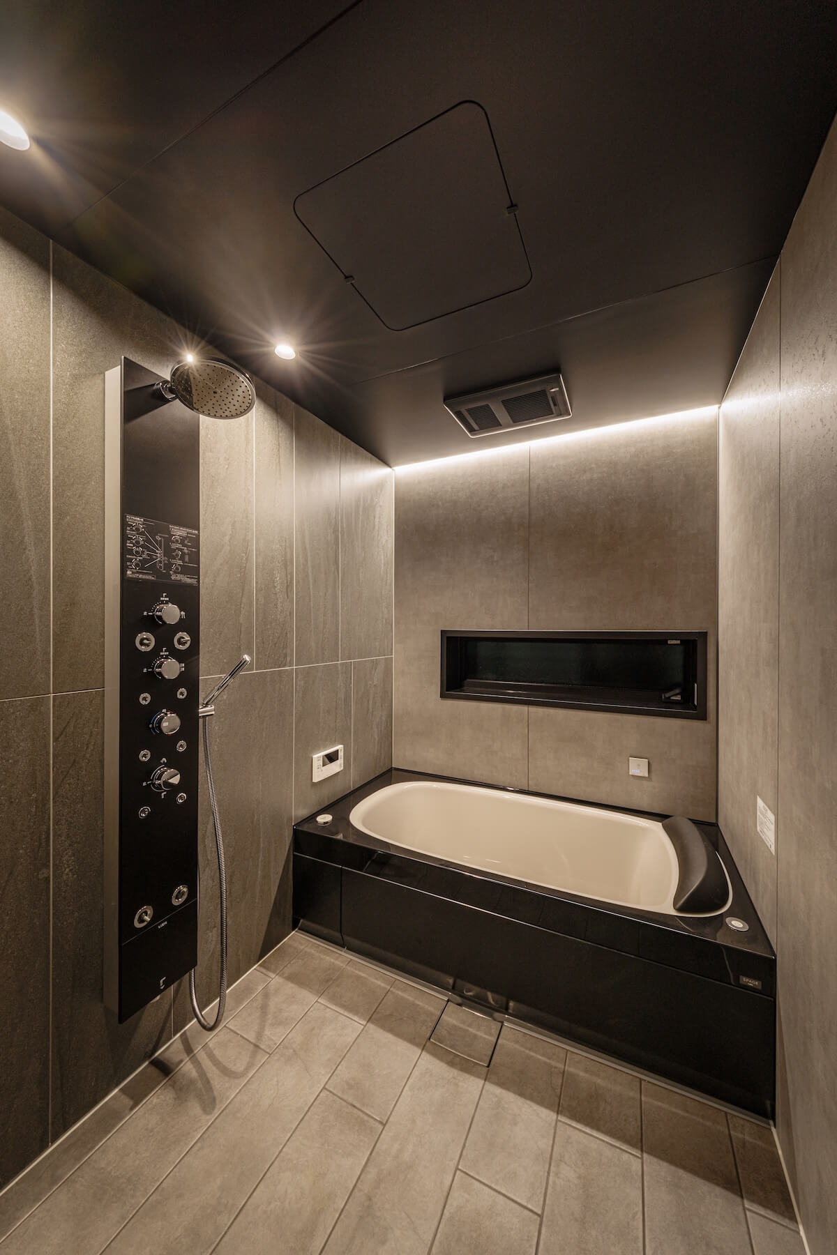 静かなライティングとダークトーンのタイルが、深呼吸したくなるような落ち着きを演出。一日の疲れをそっとほどく、癒しのためのバスルームです。