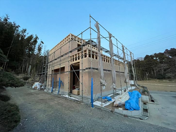 田園風景を望む、抜群のロケーションの中、無事上棟です。かなり大きな建物のため、2日掛かりで建て方を行いました。天気がいいと、作業もはかどりますね。今回の建物は、リビングにH鋼を大胆に表しで設置したブルックリンスタイルです。「WAREHOUSE(倉庫)」の名の通り、黒のガルバリウムで外観を仕上げ、アメリカンで武骨な雰囲気に仕上げていきます。