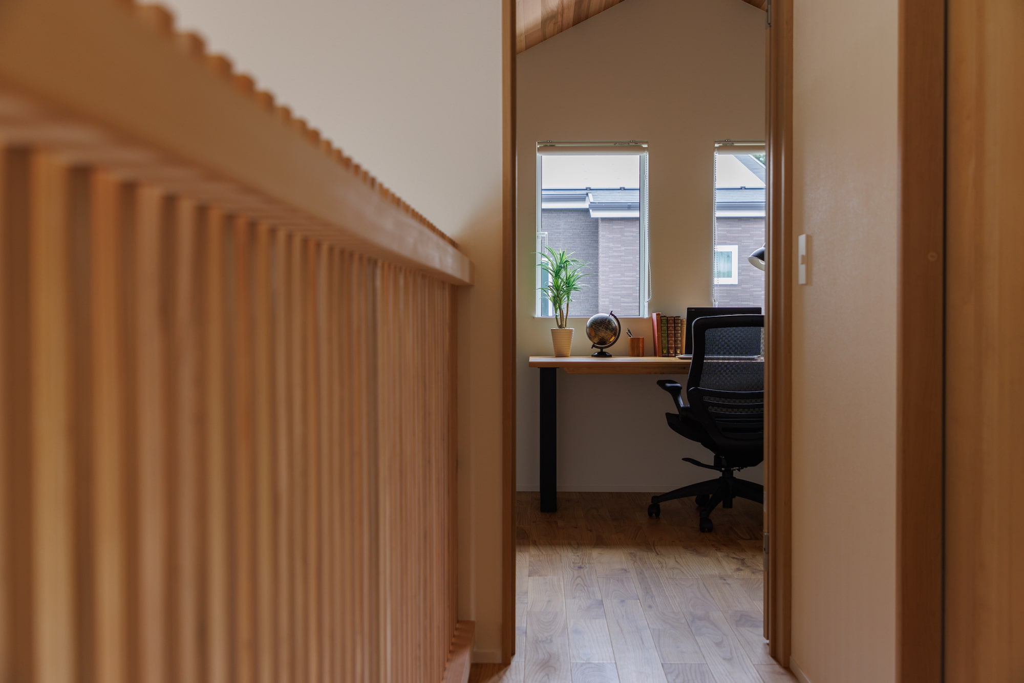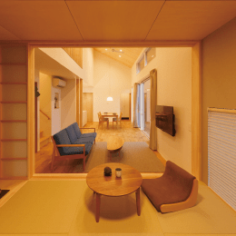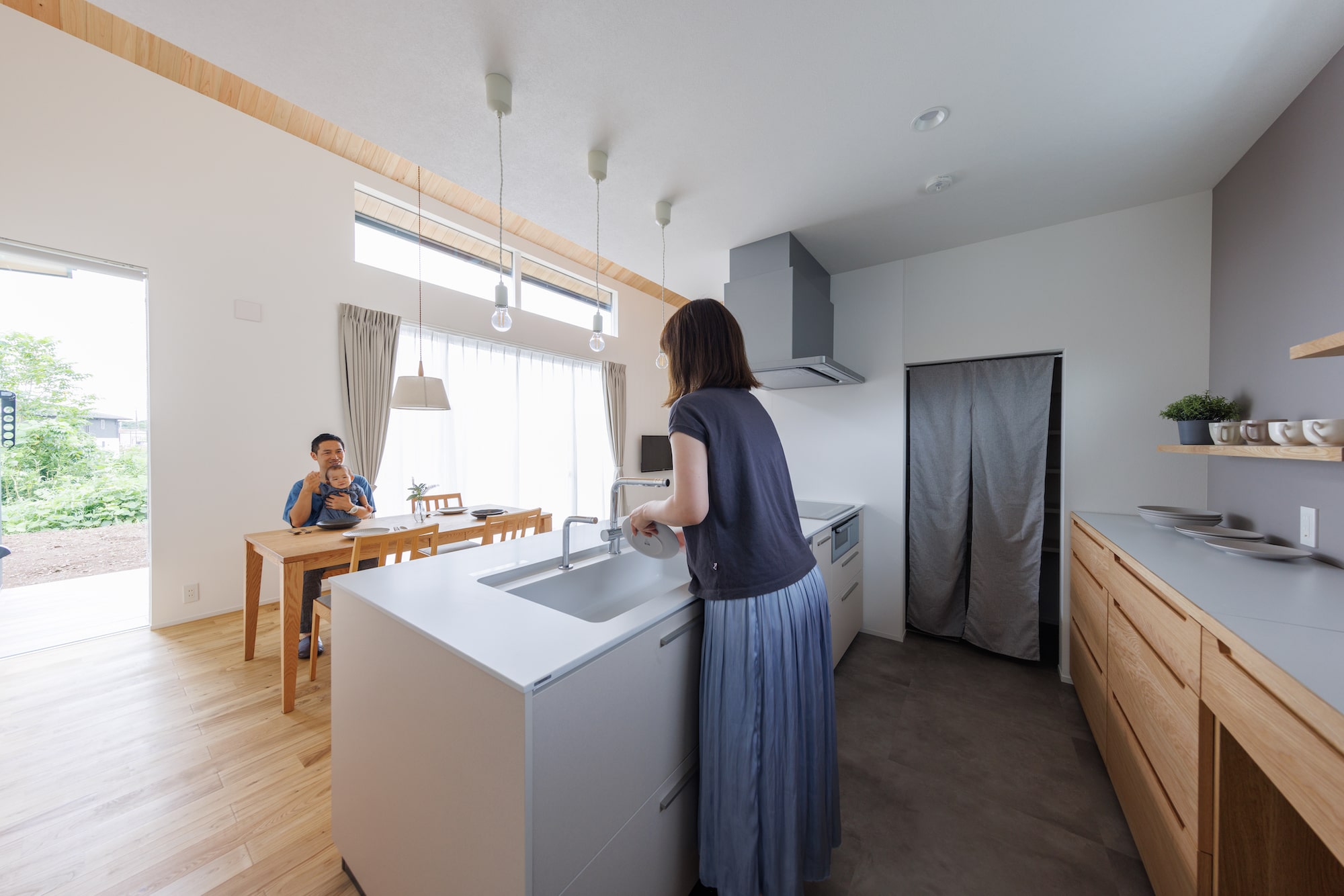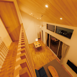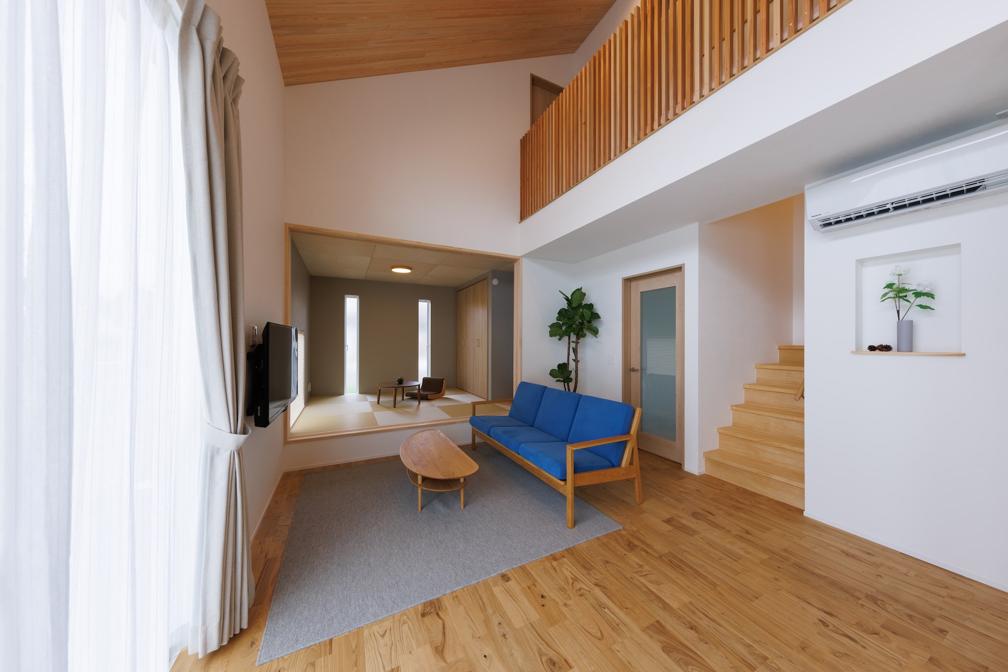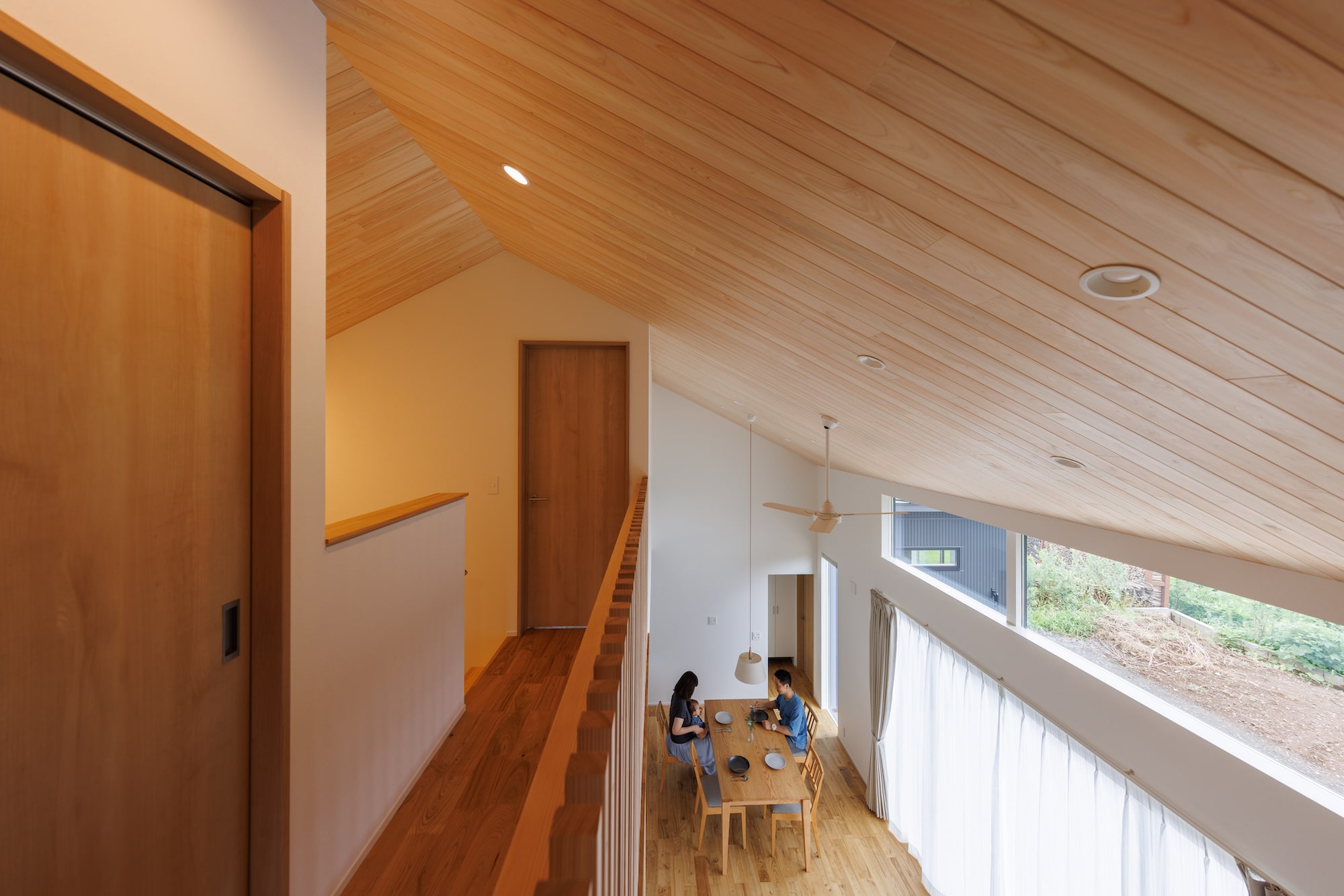 外と内。人と人。過去と未来。つながりを大切に暮らす住まい「縁(えにし)の家」。リビング全体を勾配天井の吹き抜けにして、2階の廊下とのつながりを作りました。玄関側と南側で別の表情を持ち、見る角度によってその雰囲気が変わります。