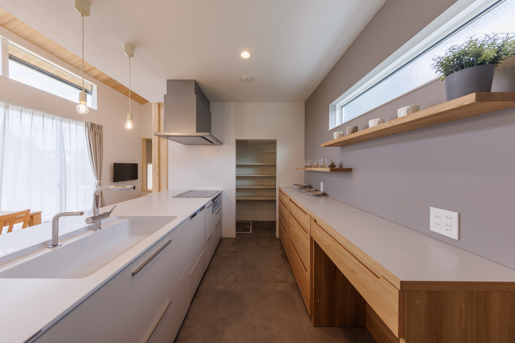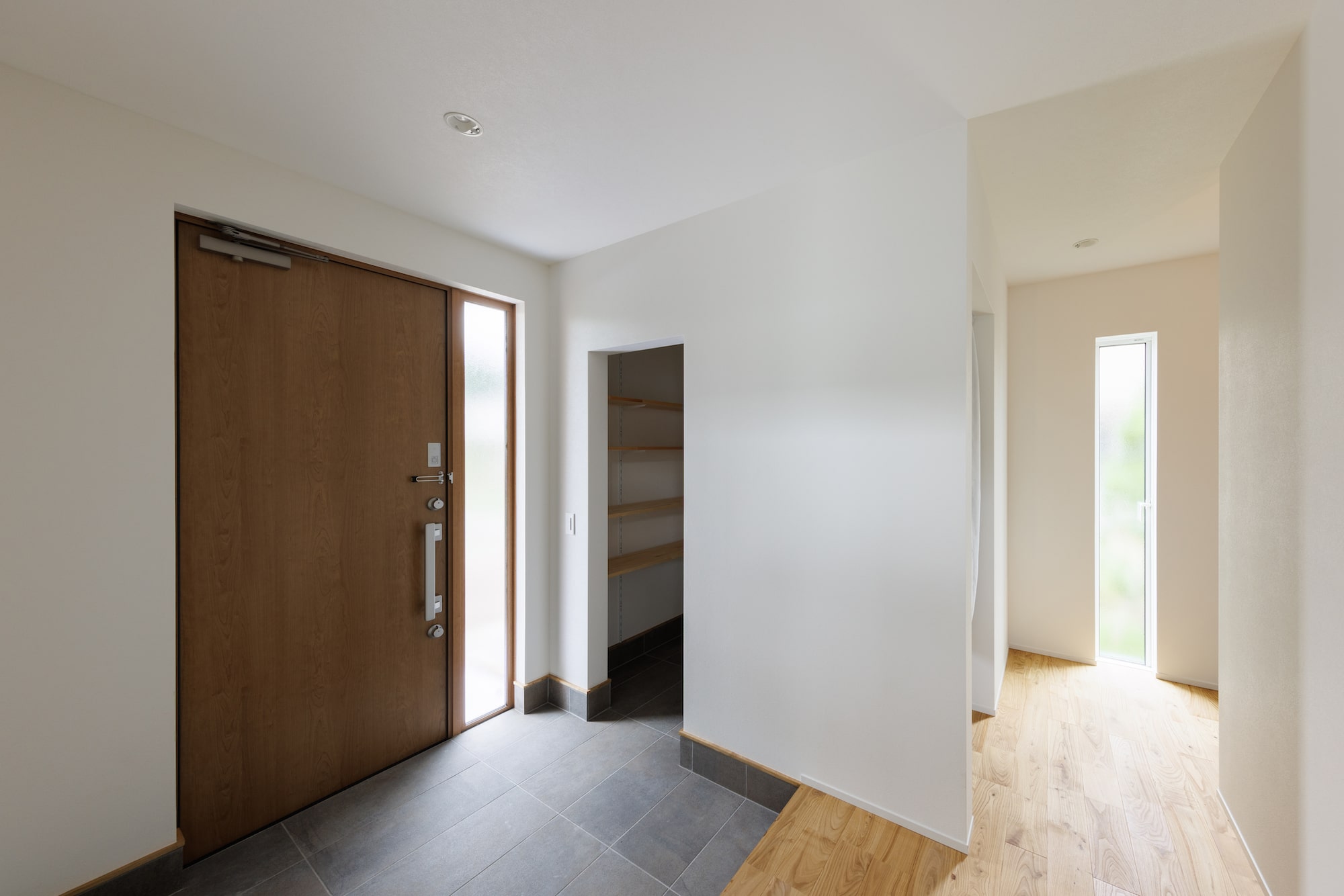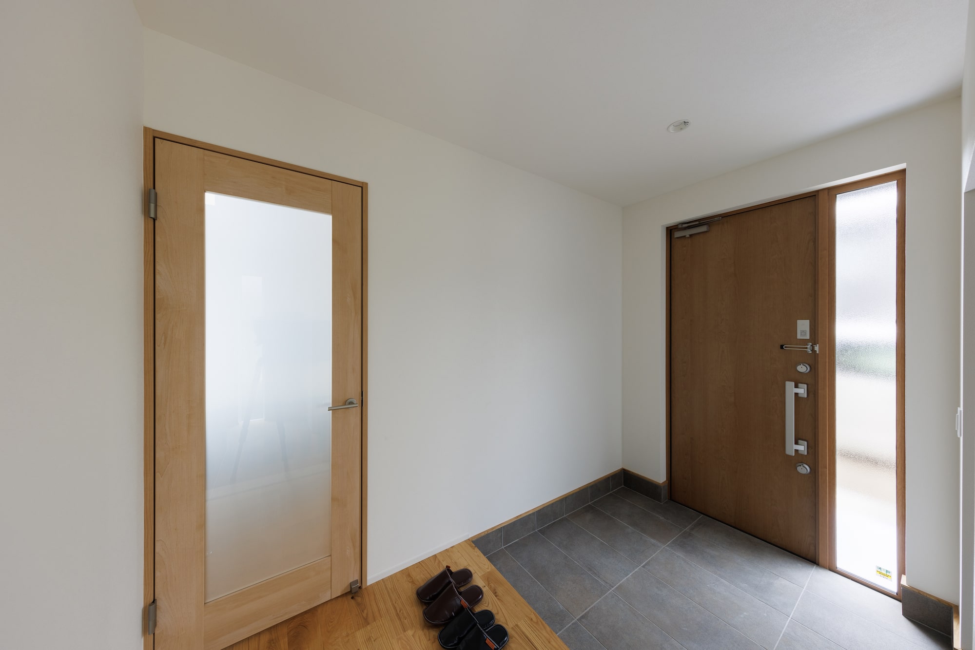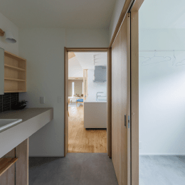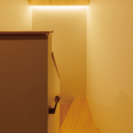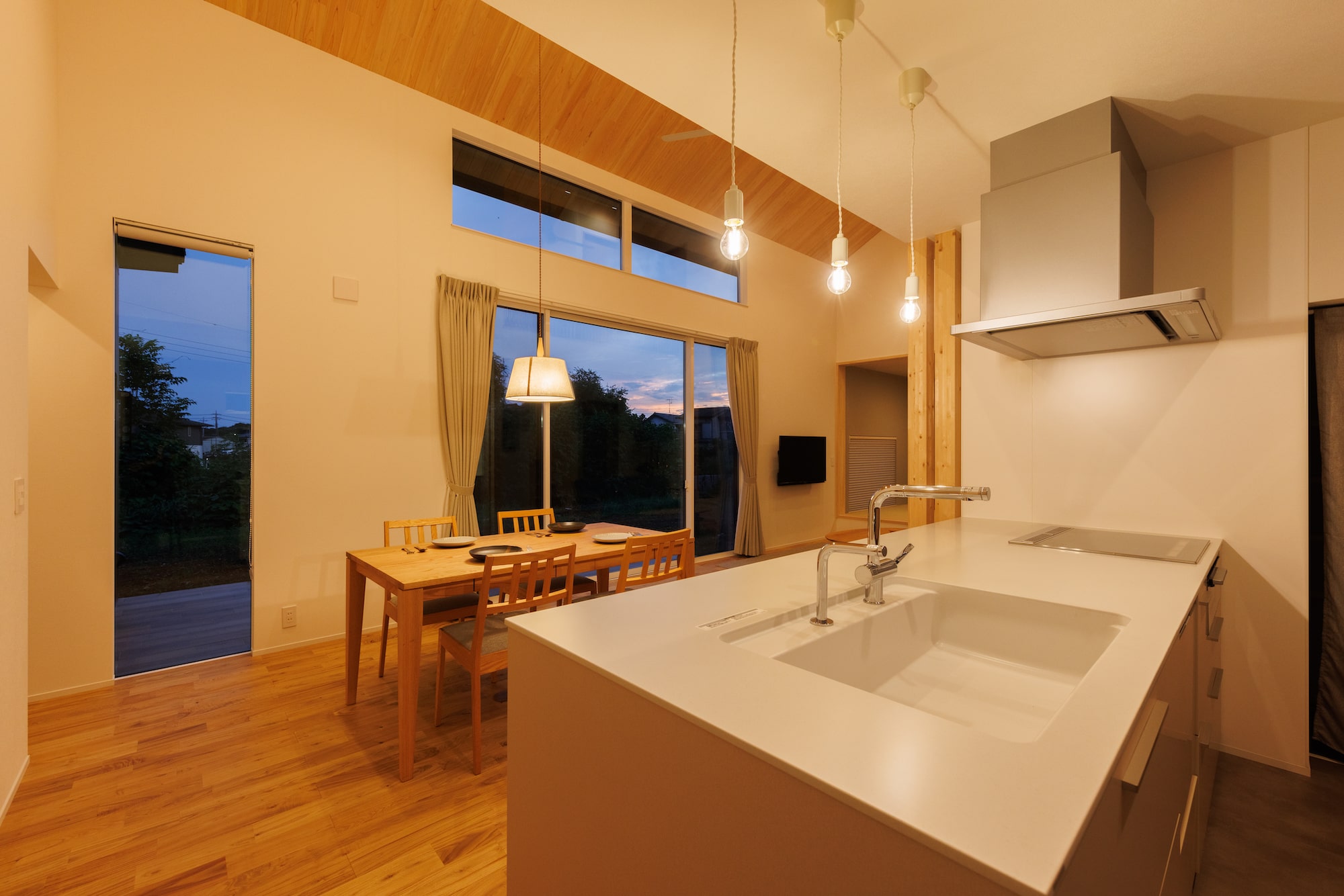外と内。人と人。過去と未来。つながりを大切に暮らす住まい「縁(えにし)の家」。リビング全体を勾配天井の吹き抜けにして、2階の廊下とのつながりを作りました。玄関側と南側で別の表情を持ち、見る角度によってその雰囲気が変わります。