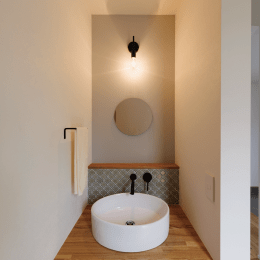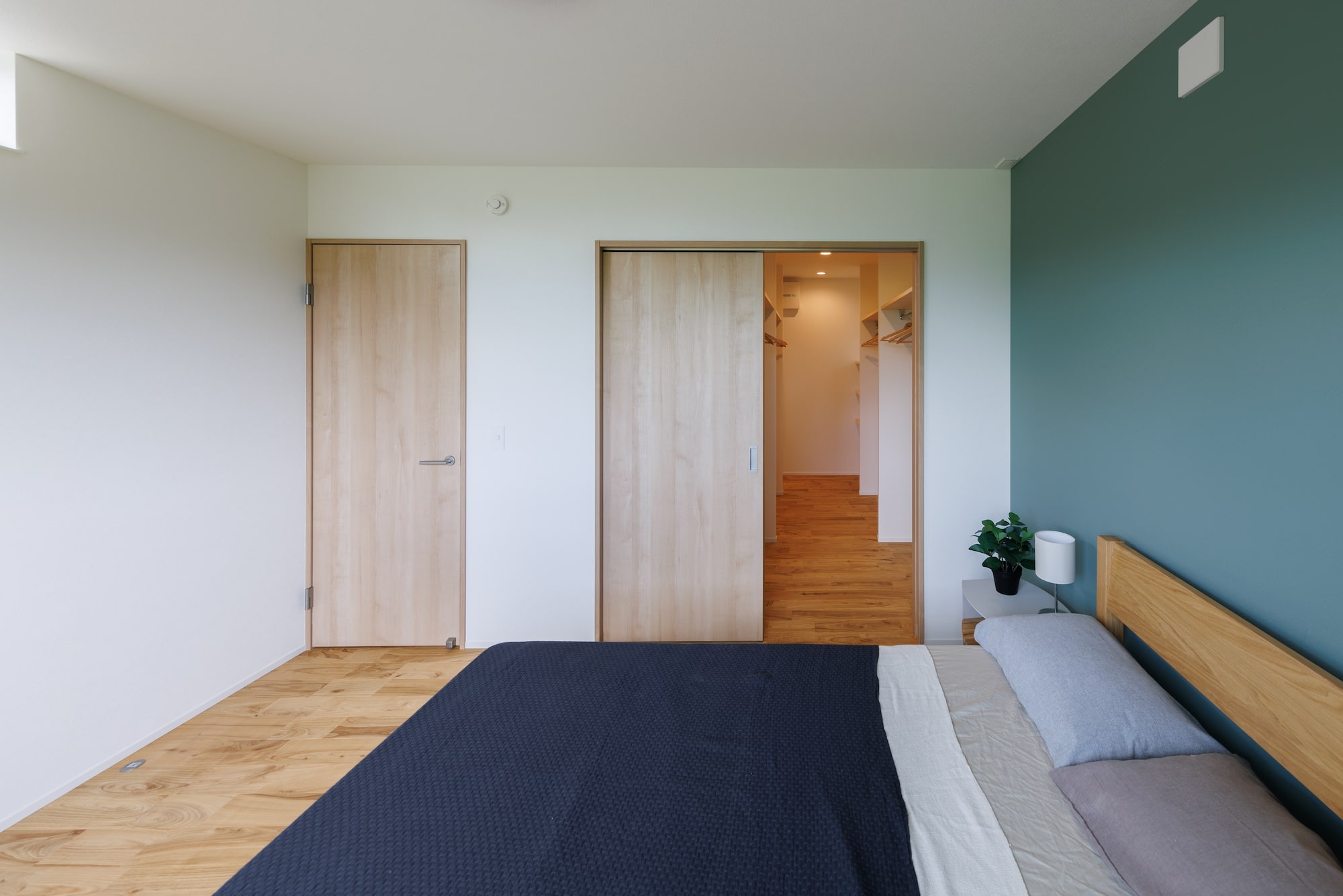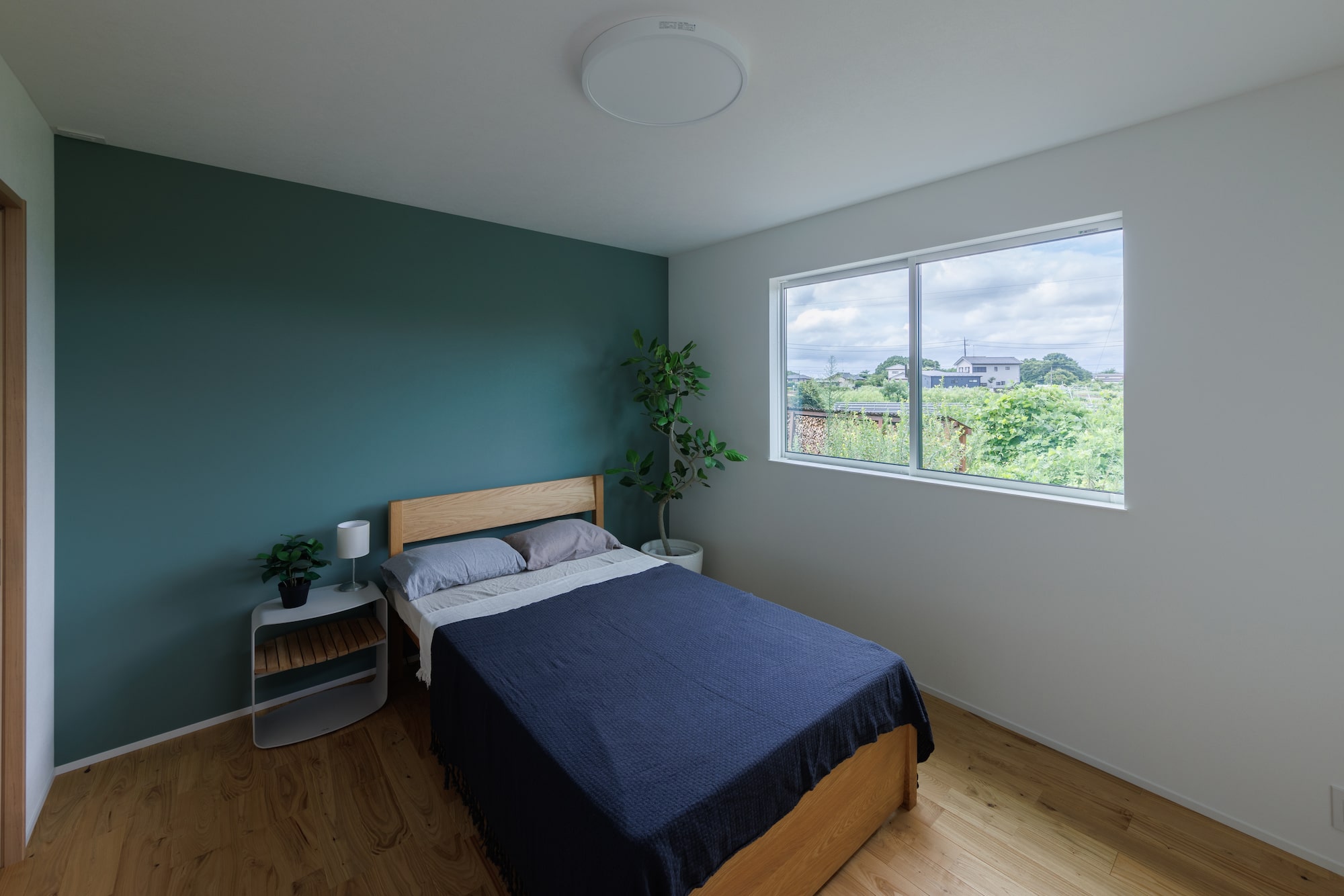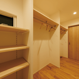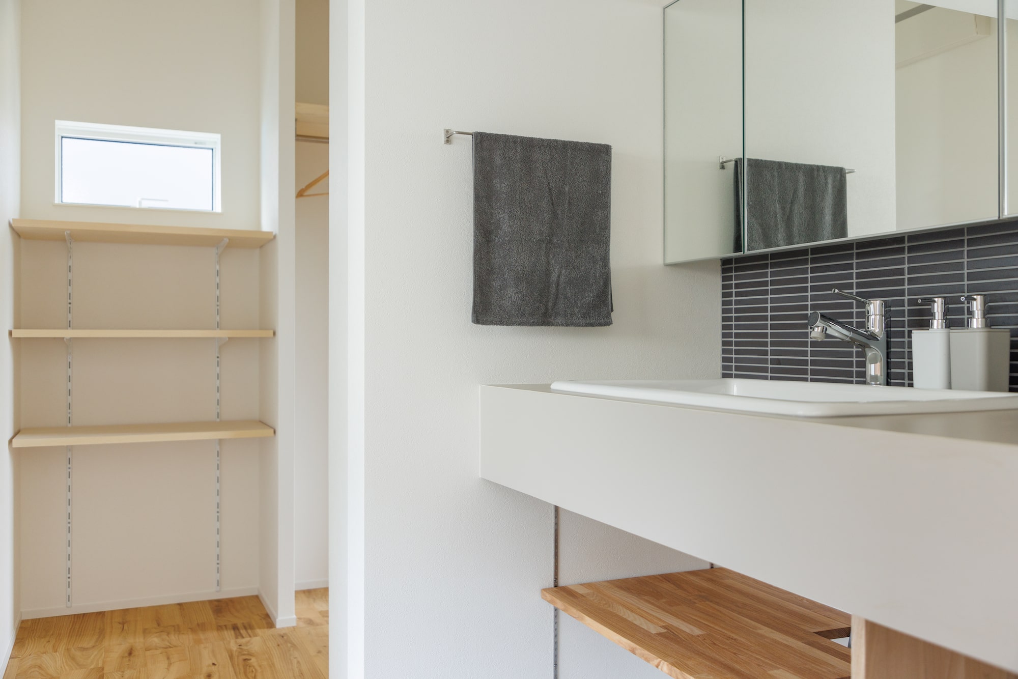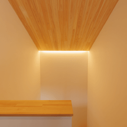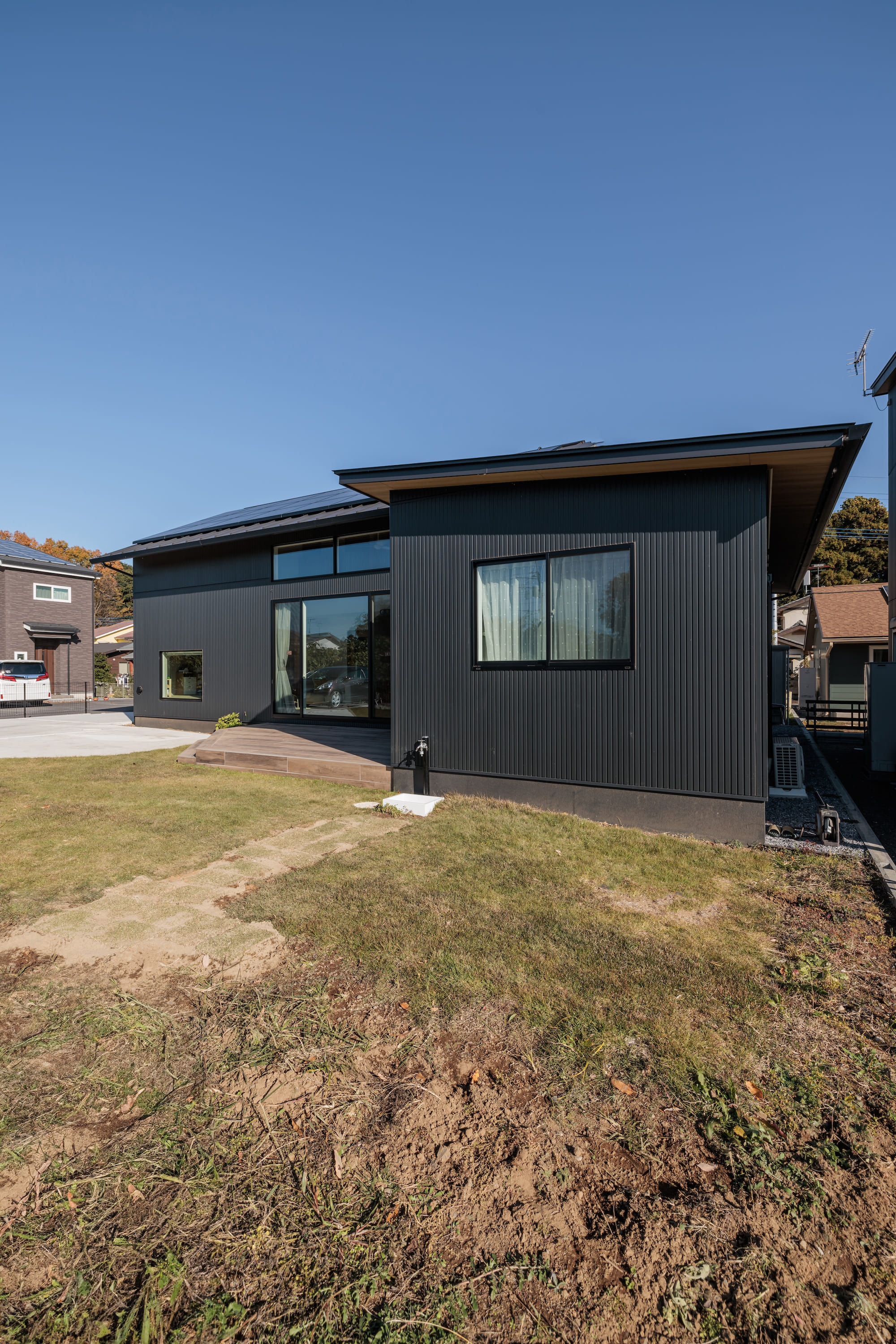外と内。人と人。過去と未来。つながりを大切に暮らす住まい「縁(えにし)の家」。リビング全体を勾配天井の吹き抜けにして、2階の廊下とのつながりを作りました。玄関側と南側で別の表情を持ち、見る角度によってその雰囲気が変わります。