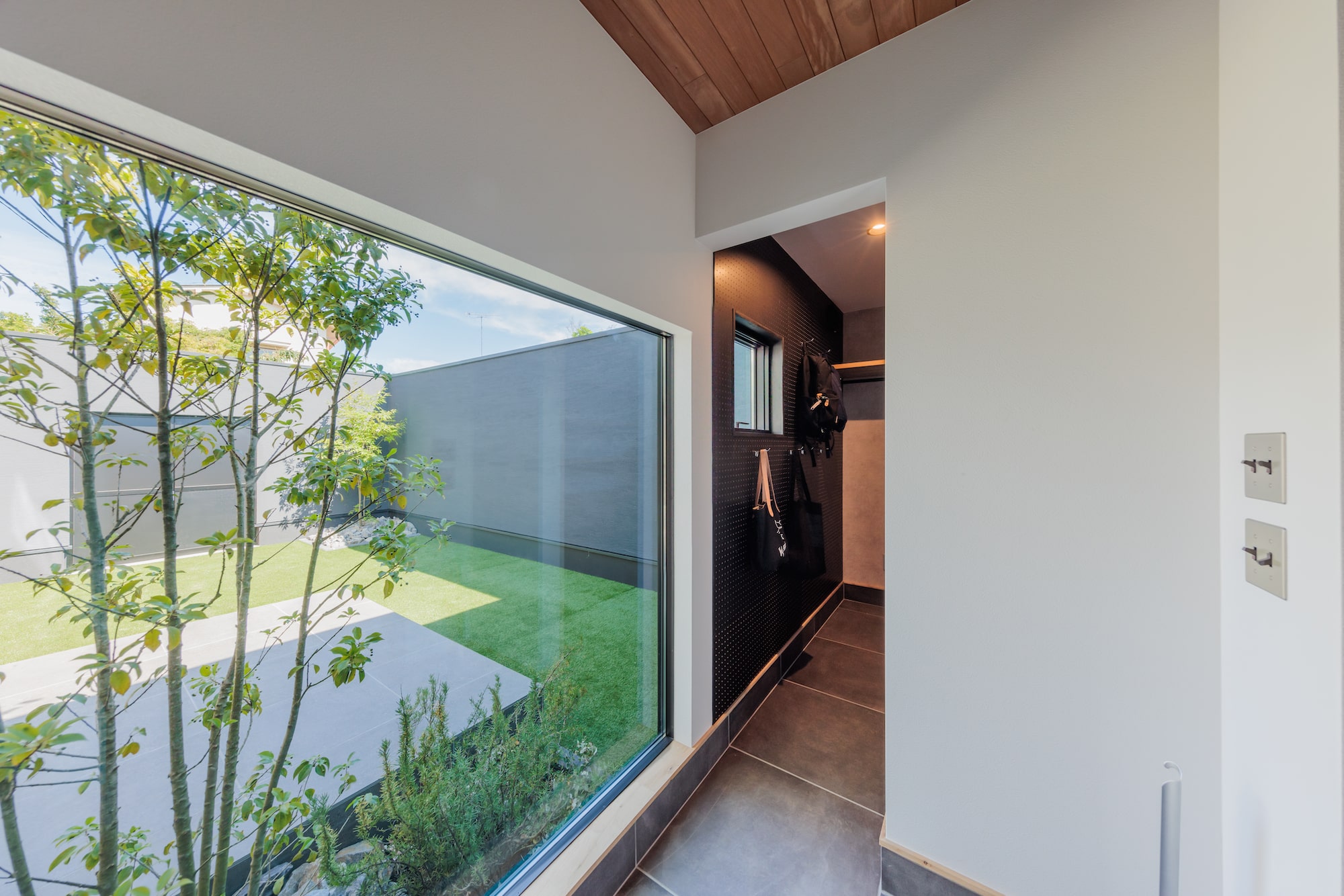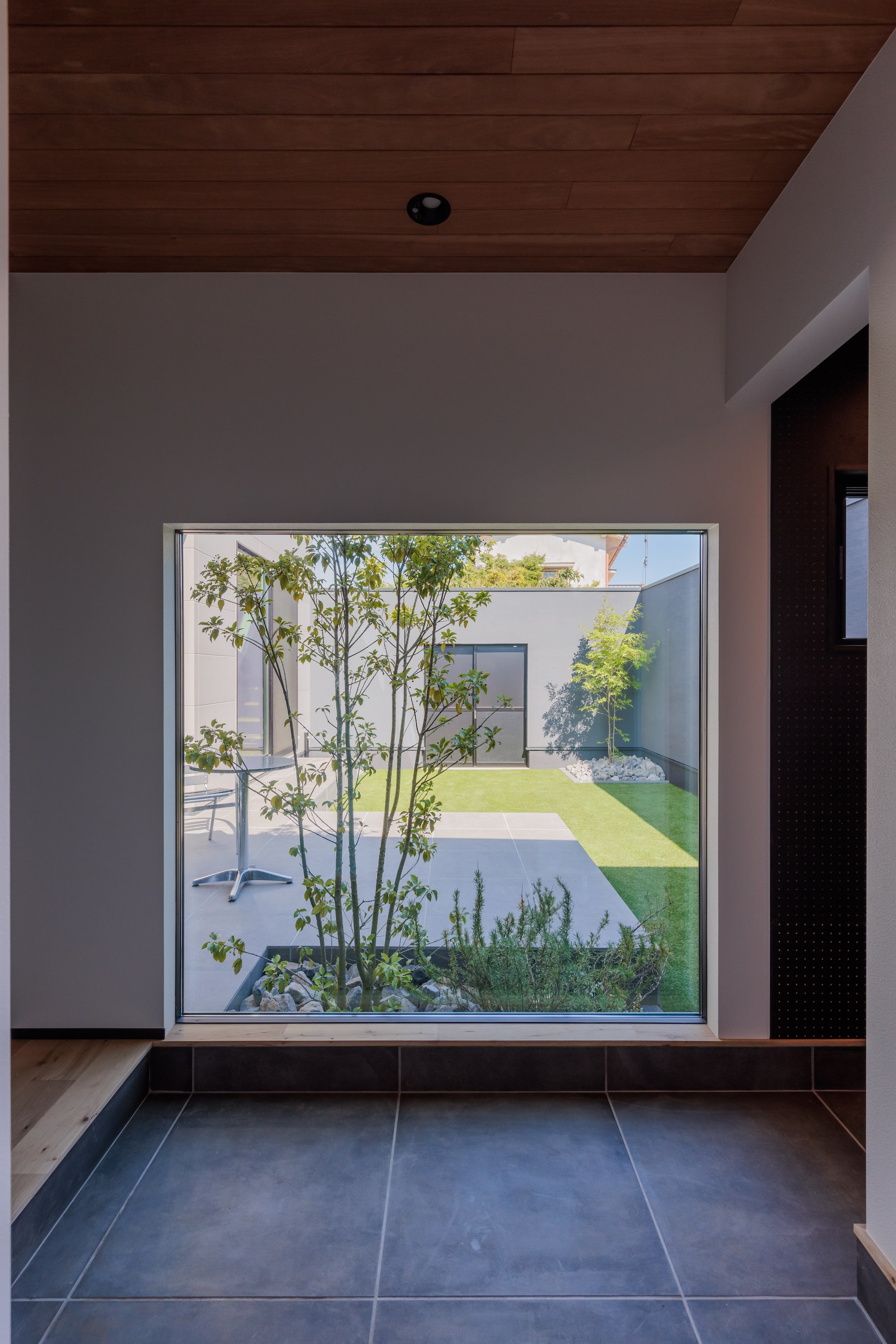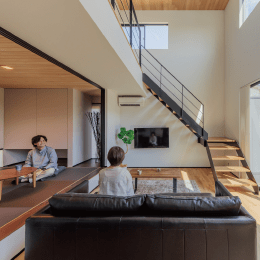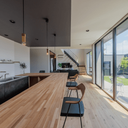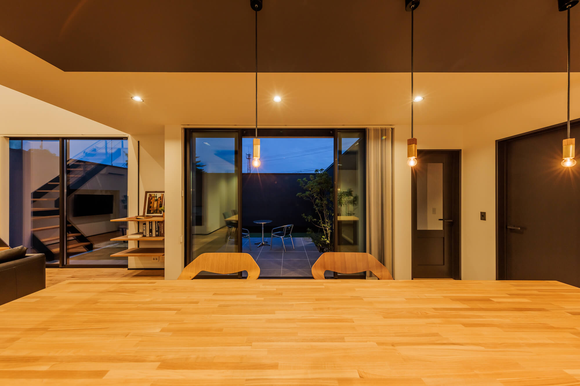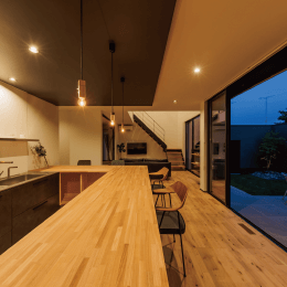 キッチンを中心に、開放的な吹き抜けと壁に囲まれたプライベートな庭を愉しめるリビング。