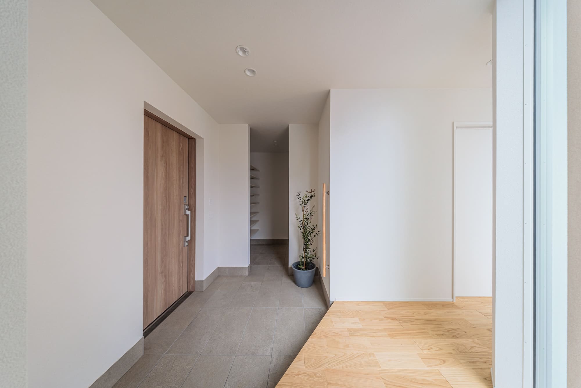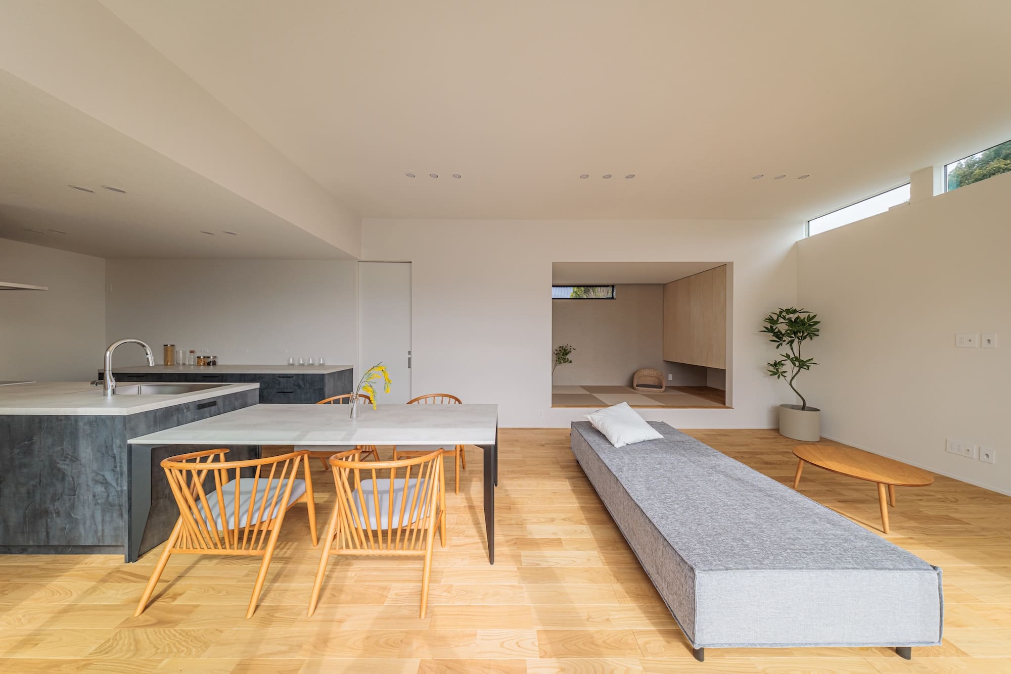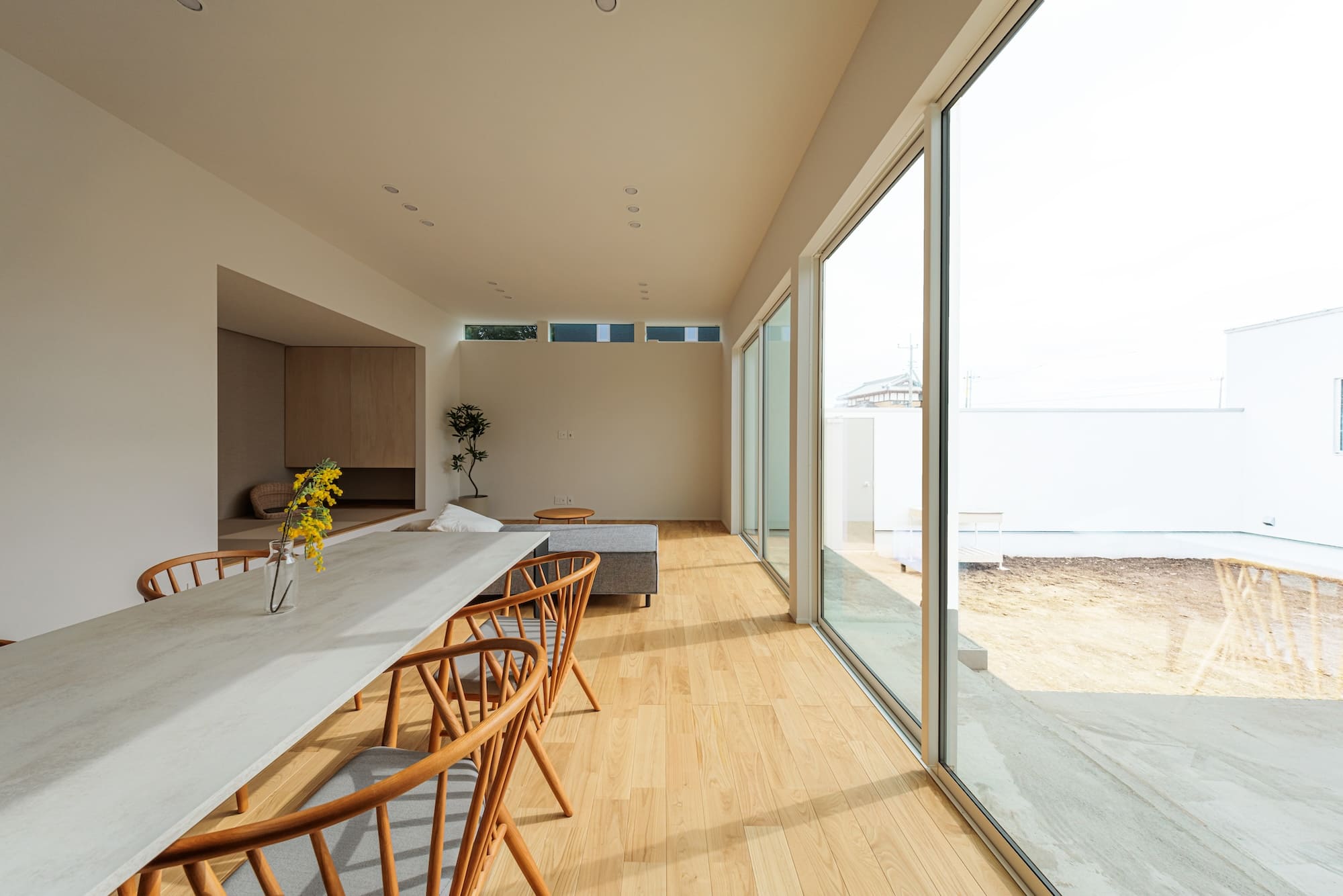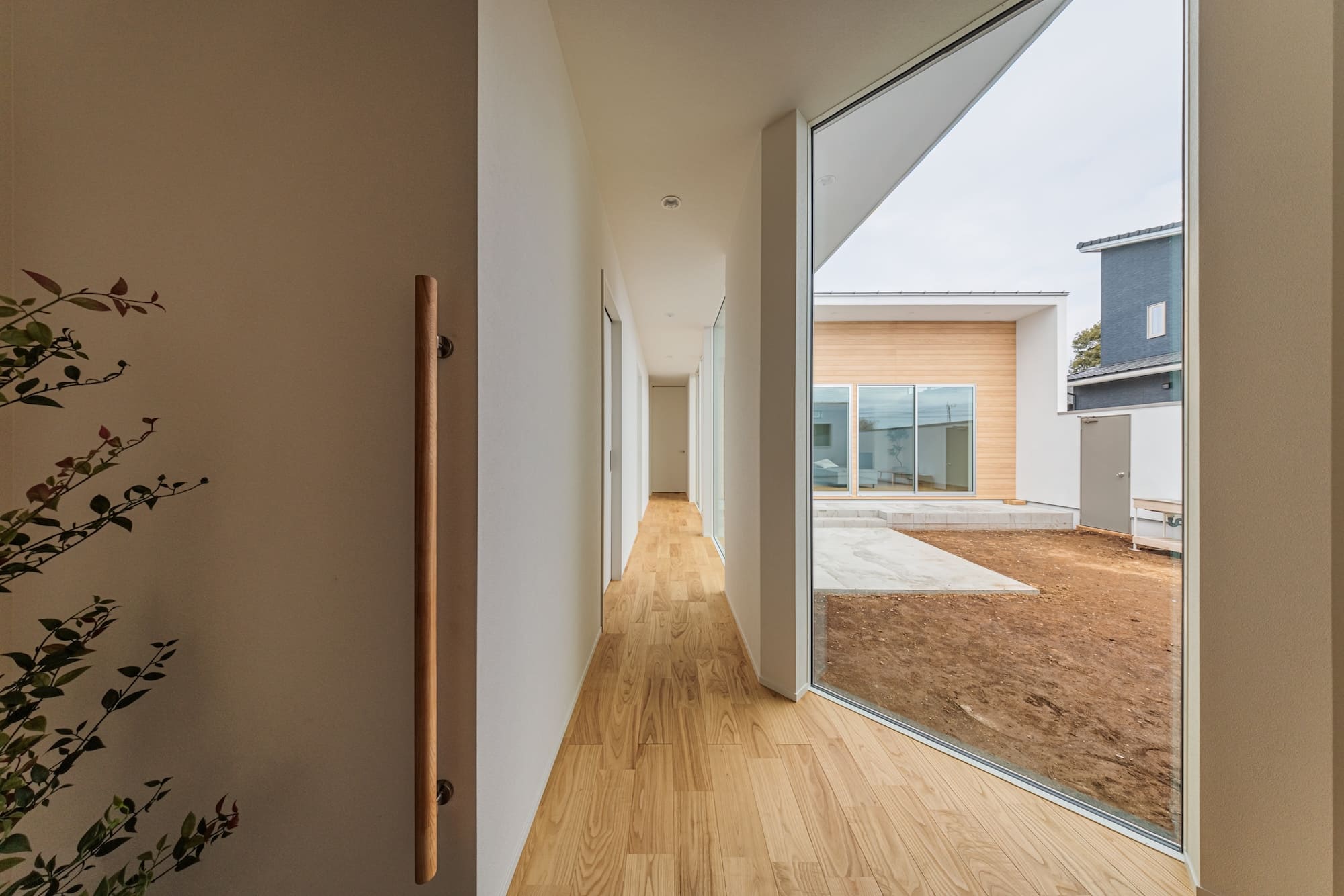 玄関ドアを開ければ、広い中庭が広がる旅館のような空間。